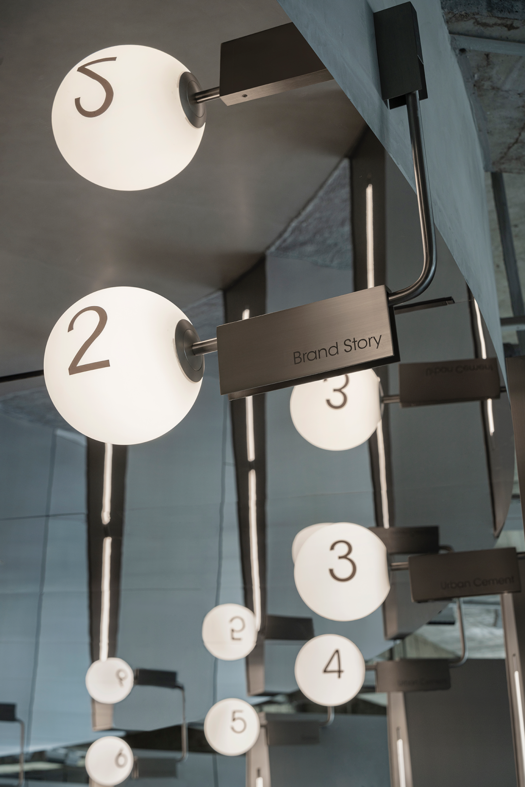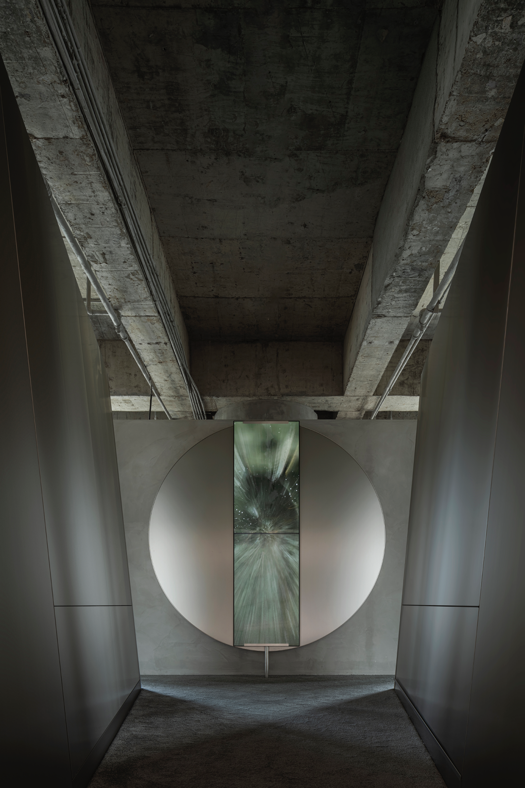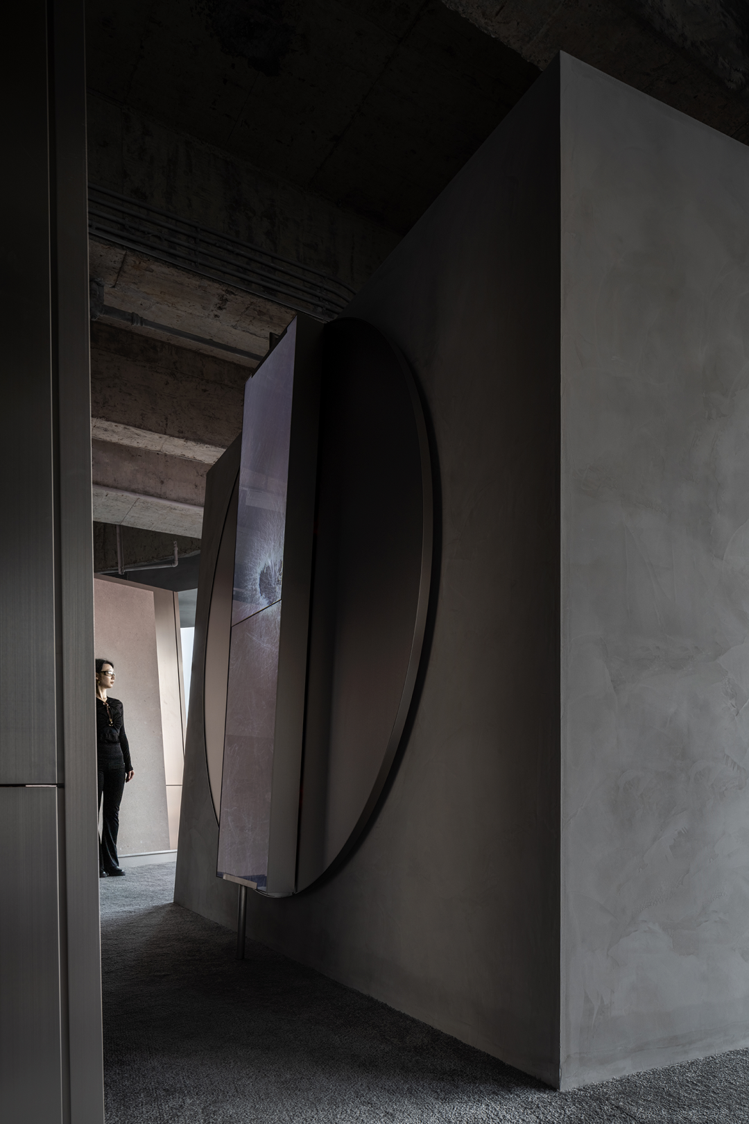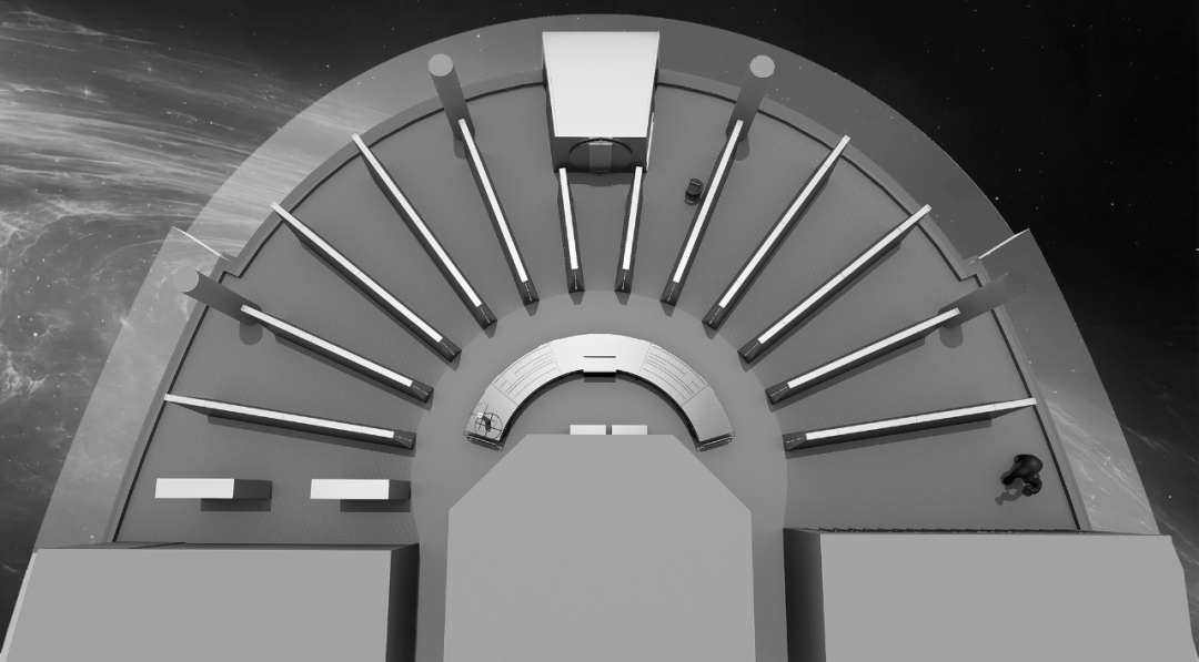 日新月异的商业潮流中,不断探索优化迭代的方式是时代所趋,为传统商业打造高端新零售空间,在价值观高度契合的基础上,设计师探索了商业新零售与科技艺术的边界,将传统陶瓷砖展厅打造为一片全新的游走于商业性、艺术性及新零售体验场所之中。泛家居建材行业通常被归类为低频消费范畴中,在信息互联网飞速发展时代,体验式商业逐渐成为社会主流消费趋势。全新费罗娜总部展厅的设计理念以科技与新零售结合为出发点,用别具一格的风格打造沉浸式新零售体验空间。其设计构想打破了行业束缚,目的是将定义为低频消费的瓷砖产品向高频零售陈列模式去转变,从而更适合在消费日常的高频消费空间中汲取灵感,将费罗娜展厅打造成高端零售展陈空间,让瓷砖这低频消费产品更吸引年轻消费者的目光。拉近产品与消费者的距离,而在行业中起引领作用需要与年轻世代链接,同频于年轻领域日常消费审美。陶瓷展厅从低频消费到高频消费场所转变,高频消费场所的空间生命周期需要拉长,从商业市场中了解消费者衣食住行的消费惯性,将情感连接,以“时尚、科技、自然、个性”为设计核心价值,营造出多感官参与的沉浸式体验空间。利用光线、空间和材料引导来访者情绪节奏,探索具有前瞻性展陈方式,让费罗娜品牌以其先锋性理念,不断引领行业发展。从硂的哑光灰到未来银,和谐又独特,诉说着费罗娜品牌相承历史,精进未来的故事。展厅原空间呈现扇形结构,全展厅平面设计因地制宜,采用放射形状布局。灵动的穿梭动线没有设限,将新零售空间赋予自由形式的转换,打破传统展厅动线设计,“去动线化”设计赋予空间最大自由度。设计师为展厅打造定向出入口,进入后在展厅陈列架之间自由穿梭,与来访者肆意行走的足迹、不自主的自然围合、随处而落。展厅采用拉丝不锈钢作为唯一的装饰材料,直立于空间中将展示产品进行分类,而作为展厅中心的“岛台”成为视觉交汇中心点,展厅外围落地玻璃窗,将自然光线融入室内,丰富的光线与产品相互交融,还原产品自然的本质。生活逐渐脱离复杂化,而追求一种以最短距离将材料、功能、形态结合起来的合理性,及单纯性、个性表达之余,空间内被置入尝试与体验式的设定之中。空间的有机与自然的变化,在游走中感知材质的交融。平面排列放射线设计,14个门道围列成扇形平面的展厅,定制球型灯饰环绕半空,再现宇宙星际的品牌之源。室外光线从门道照射进展厅,立体而灵动,贯彻空间的通透感,赋予展厅更无拘的自述力同时雕刻了空间的模样。利用光线、空间和材料引导来访者的情绪节奏,体现大空间容纳多样展陈的优势,创造不一样的展示空间。全展厅拉丝不锈钢金属的运用,超高的品质感营造出炫酷的未来科技氛围,各种距离的弧线在平面或立面关系中交错呈现,融入在整体的空间氛围之中,又找到充满平衡感的韵律。设计突破常规实用的领域,向艺术领域探索。14个门道也是14面展墙,每个展墙上展示不同规格产品,通过金属插件调节,更加灵活地展示产品的多样性。展墙上方是多媒体数字屏,放着带节奏音乐,屏幕上形态各异的产品纹理交相辉映犹如银河,球型灯饰如同无数颗星球悬浮其中。令人不禁遐想到科幻电影中飞船在不同空间里航行,声光电的融合使整个空间充满未来感。展架跳脱出传统的木料和绒布组合,采用不锈钢材质,并在用户产品挑选区域铺上地毯,为来访者提供在随性游走之间,感受自然、舒适、充满人性化的选物体验。在冷暖碰撞、新旧更替之间,通过不同材质的创造性发挥,给人以独特的感官体验。