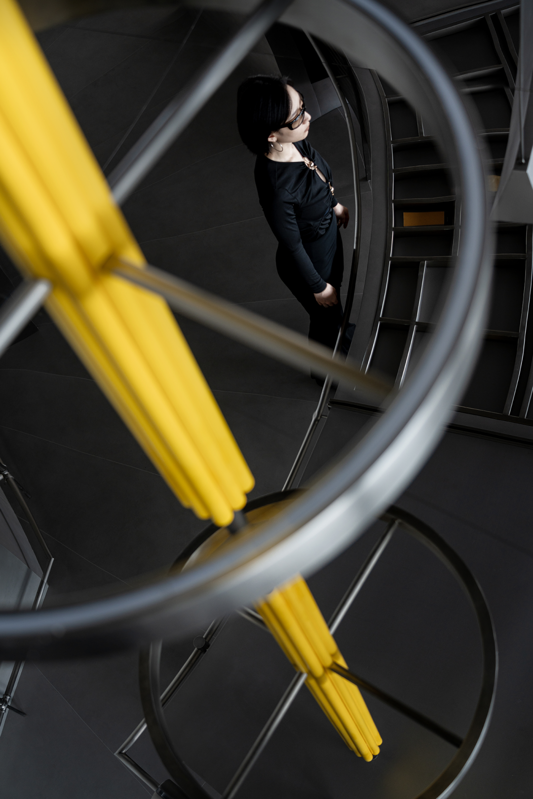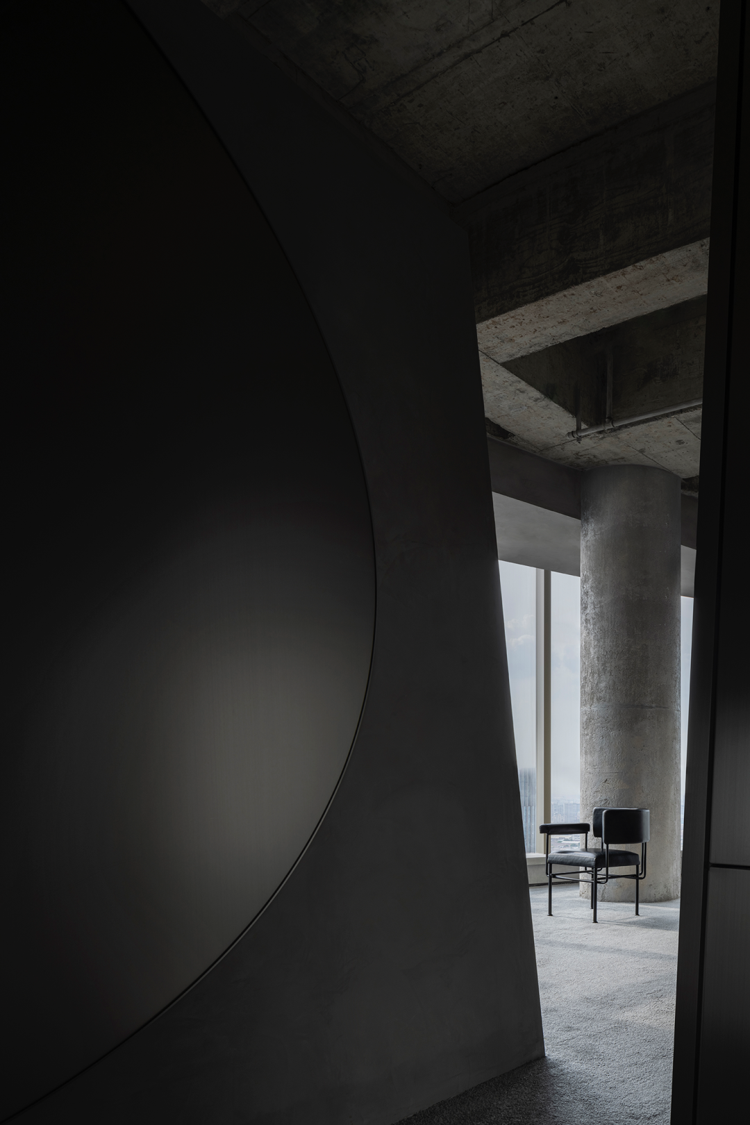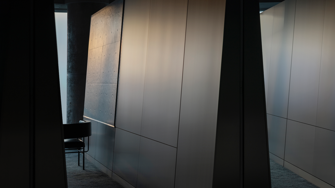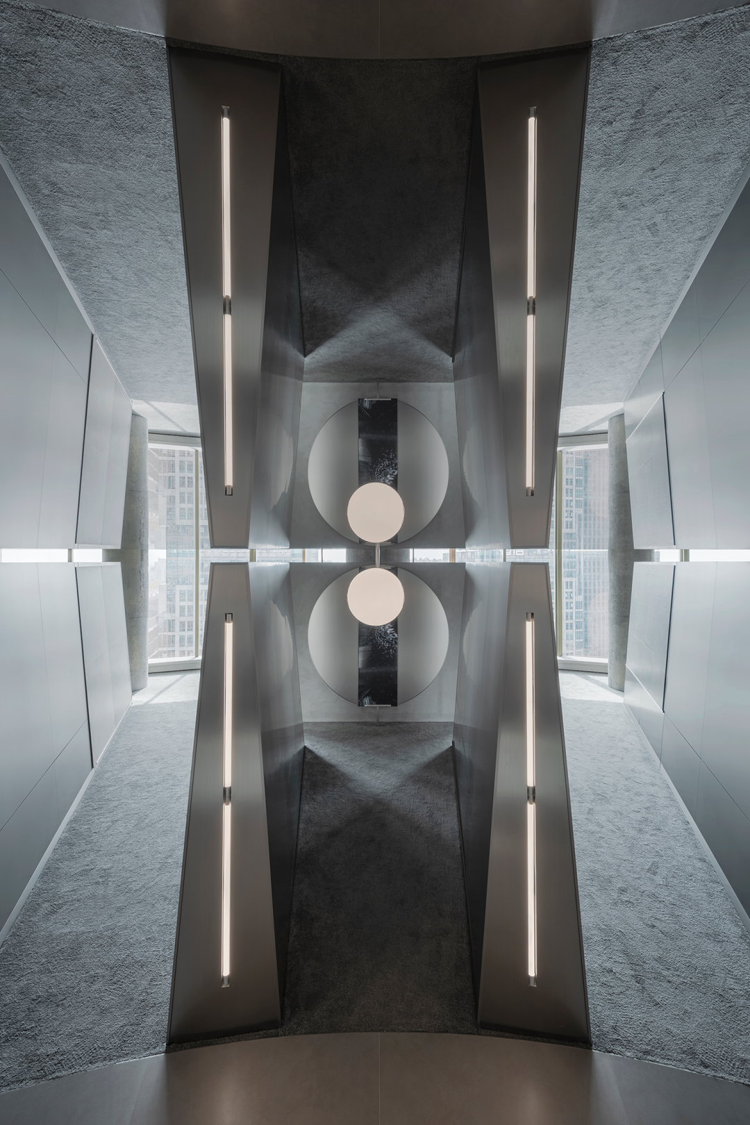 日新月异的商业潮流中,不断探索优化迭代的方式是时代所趋,为传统商业打造高端新零售空间,在价值观高度契合的基础上,设计师探索了商业新零售与科技艺术的边界,将传统陶瓷砖展厅打造为一片全新的游走于商业性、艺术性及新零售体验场所之中。泛家居建材行业通常被归类为低频消费范畴中,在信息互联网飞速发展时代,体验式商业逐渐成为社会主流消费趋势。全新费罗娜总部展厅的设计理念以科技与新零售结合为出发点,用别具一格的风格打造沉浸式新零售体验空间。其设计构想打破了行业束缚,目的是将定义为低频消费的瓷砖产品向高频零售陈列模式去转变,从而更适合在消费日常的高频消费空间中汲取灵感,将费罗娜展厅打造成高端零售展陈空间,让瓷砖这低频消费产品更吸引年轻消费者的目光。拉近产品与消费者的距离,而在行业中起引领作用需要与年轻世代链接,同频于年轻领域日常消费审美。陶瓷展厅从低频消费到高频消费场所转变,高频消费场所的空间生命周期需要拉长,从商业市场中了解消费者衣食住行的消费惯性,将情感连接,以“时尚、科技、自然、个性”为设计核心价值,营造出多感官参与的沉浸式体验空间。利用光线、空间和材料引导来访者情绪节奏,探索具有前瞻性展陈方式,让费罗娜品牌以其先锋性理念,不断引领行业发展。从硂的哑光灰到未来银,和谐又独特,诉说着费罗娜品牌相承历史,精进未来的故事。展厅原空间呈现扇形结构,全展厅平面设计因地制宜,采用放射形状布局。灵动的穿梭动线没有设限,将新零售空间赋予自由形式的转换,打破传统展厅动线设计,“去动线化”设计赋予空间最大自由度。设计师为展厅打造定向出入口,进入后在展厅陈列架之间自由穿梭,与来访者肆意行走的足迹、不自主的自然围合、随处而落。展厅采用拉丝不锈钢作为唯一的装饰材料,直立于空间中将展示产品进行分类,而作为展厅中心的“岛台”成为视觉交汇中心点,展厅外围落地玻璃窗,将自然光线融入室内,丰富的光线与产品相互交融,还原产品自然的本质。生活逐渐脱离复杂化,而追求一种以最短距离将材料、功能、形态结合起来的合理性,及单纯性、个性表达之余,空间内被置入尝试与体验式的设定之中。空间的有机与自然的变化,在游走中感知材质的交融。平面排列放射线设计,14个门道围列成扇形平面的展厅,定制球型灯饰环绕半空,再现宇宙星际的品牌之源。室外光线从门道照射进展厅,立体而灵动,贯彻空间的通透感,赋予展厅更无拘的自述力同时雕刻了空间的模样。利用光线、空间和材料引导来访者的情绪节奏,体现大空间容纳多样展陈的优势,创造不一样的展示空间。全展厅拉丝不锈钢金属的运用,超高的品质感营造出炫酷的未来科技氛围,各种距离的弧线在平面或立面关系中交错呈现,融入在整体的空间氛围之中,又找到充满平衡感的韵律。设计突破常规实用的领域,向艺术领域探索。14个门道也是14面展墙,每个展墙上展示不同规格产品,通过金属插件调节,更加灵活地展示产品的多样性。展墙上方是多媒体数字屏,放着带节奏音乐,屏幕上形态各异的产品纹理交相辉映犹如银河,球型灯饰如同无数颗星球悬浮其中。令人不禁遐想到科幻电影中飞船在不同空间里航行,声光电的融合使整个空间充满未来感。展架跳脱出传统的木料和绒布组合,采用不锈钢材质,并在用户产品挑选区域铺上地毯,为来访者提供在随性游走之间,感受自然、舒适、充满人性化的选物体验。在冷暖碰撞、新旧更替之间,通过不同材质的创造性发挥,给人以独特的感官体验。