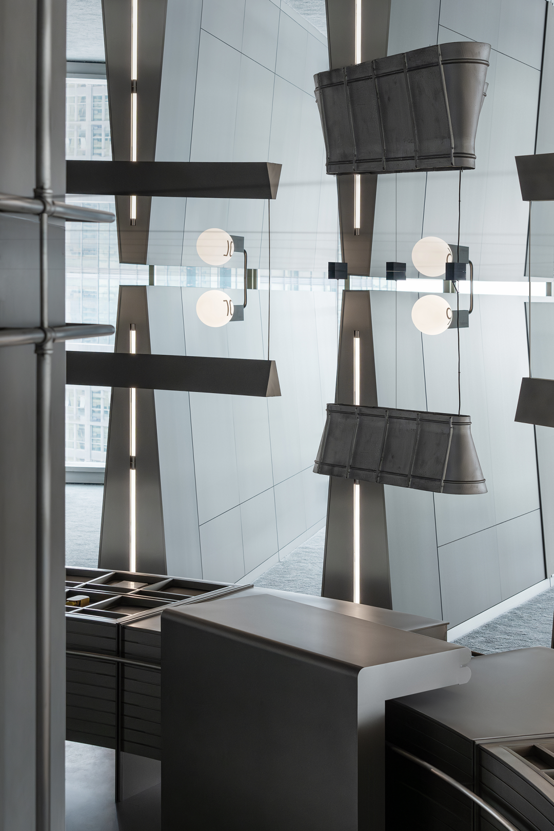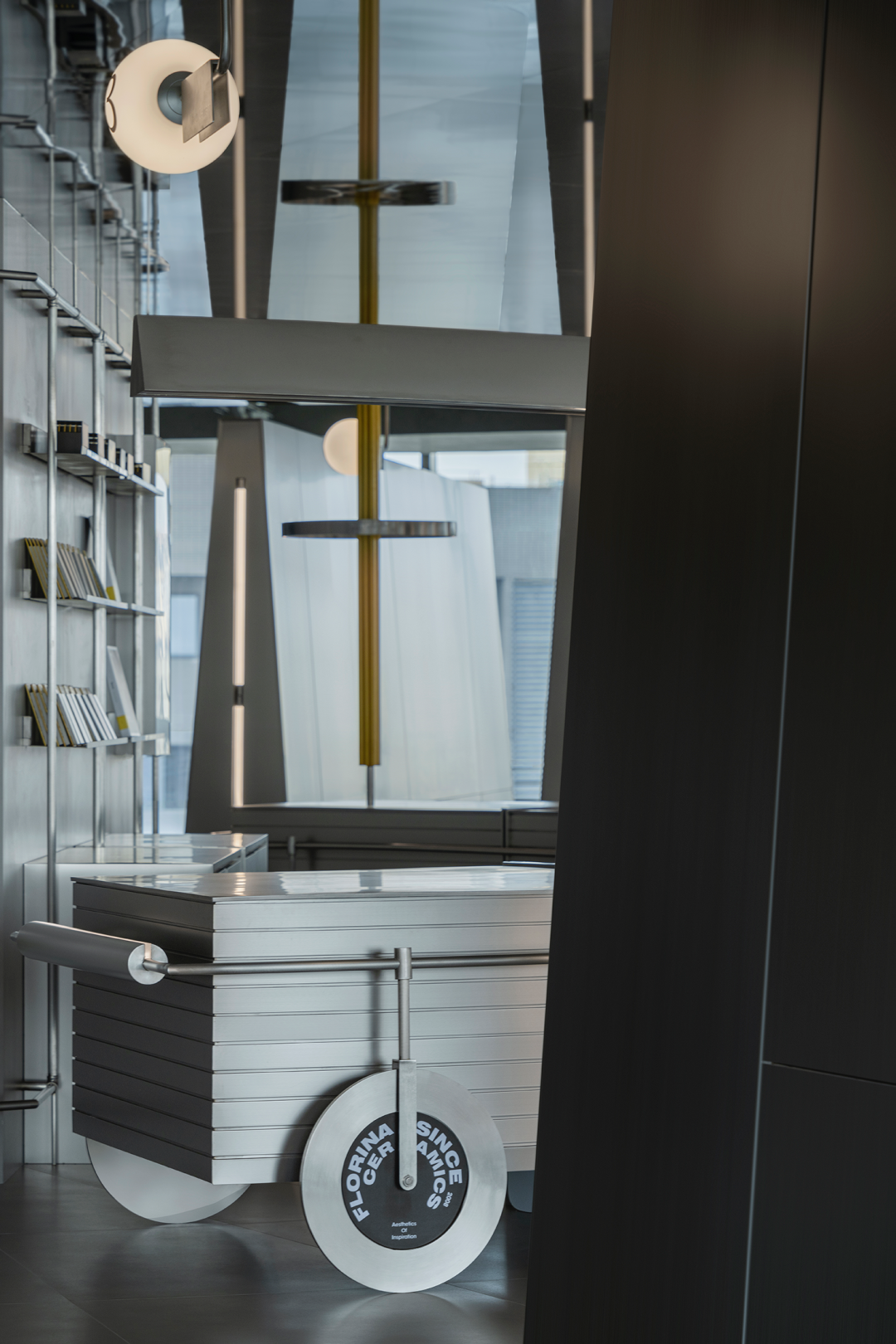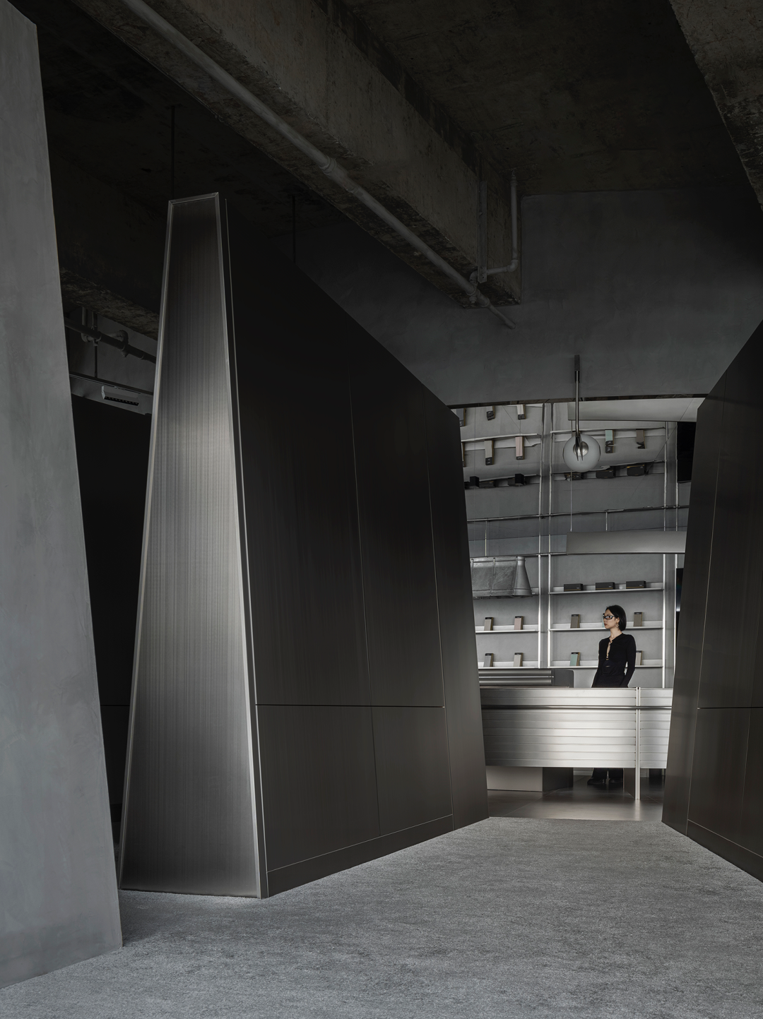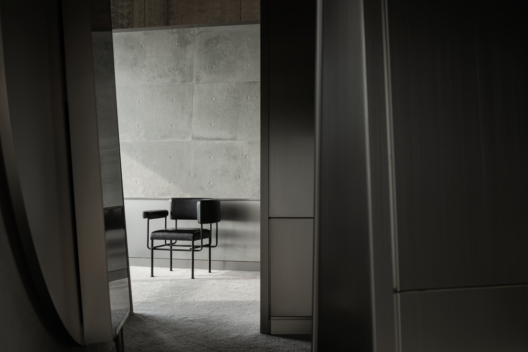 拉丝不锈钢的展示墙上,对应落地玻璃反映进来的自然光,充盈整个展示空间,玻璃窗外折影所出的光影如壁画嵌入,与之融为一体。时而充满张力,时而隐忍,在“弧线”与“光影”之中突出产品优点最大化的设计当中,来访者可在自然光与灯光下感受产品的不同质感。最大程度增加光线,扩大视野,凭依光影与灯光交错的影语构建属于展厅的未来感氛围。品牌方以链接新世代年轻人品味喜好,及其对商品消费的理解作为商业目的,打造新颖的品牌跨界周边产品,与年轻消费者共鸣。产品陈列展示运用台面与立柜之间高低组合、错落有致的设计手法,产生富有趣味的视觉体验。不锈钢材质材料的运用,更衬托出商品的高级感,其包裹性与节奏营造出更深层次的新零售陈列岛台展示区域。“岛台”作为展厅空间中心位置,满足了空间品牌多功能展示周边产品形态,既是所有通道的起点,也是所有通道的终点,以多条行径打通空间中心点的链接。岛台空间打造成新商业零售场景,以“小样车”形式展现品牌创意周边产品。展厅同时设有直播间,以年轻人青睐的线上沟通方式,拓展品牌受众疆域。作为注重可持续发展理念的费罗娜品牌,设计师在展厅整体设计和建造选材中运用了大量可循环利用的不锈钢材料,以及可拆卸并能进行二次循环利用的建造材质,如展示架等产品,体现品牌与设计师共同秉承的绿色环保理念。主要材料|拉丝不锈钢、镜面不锈钢、费罗娜水泥瓷砖、灰色地毯部分品牌|Stellar Works、Magis、B&O、Qeeboo、Vondom、Departo、本土创造BENTU