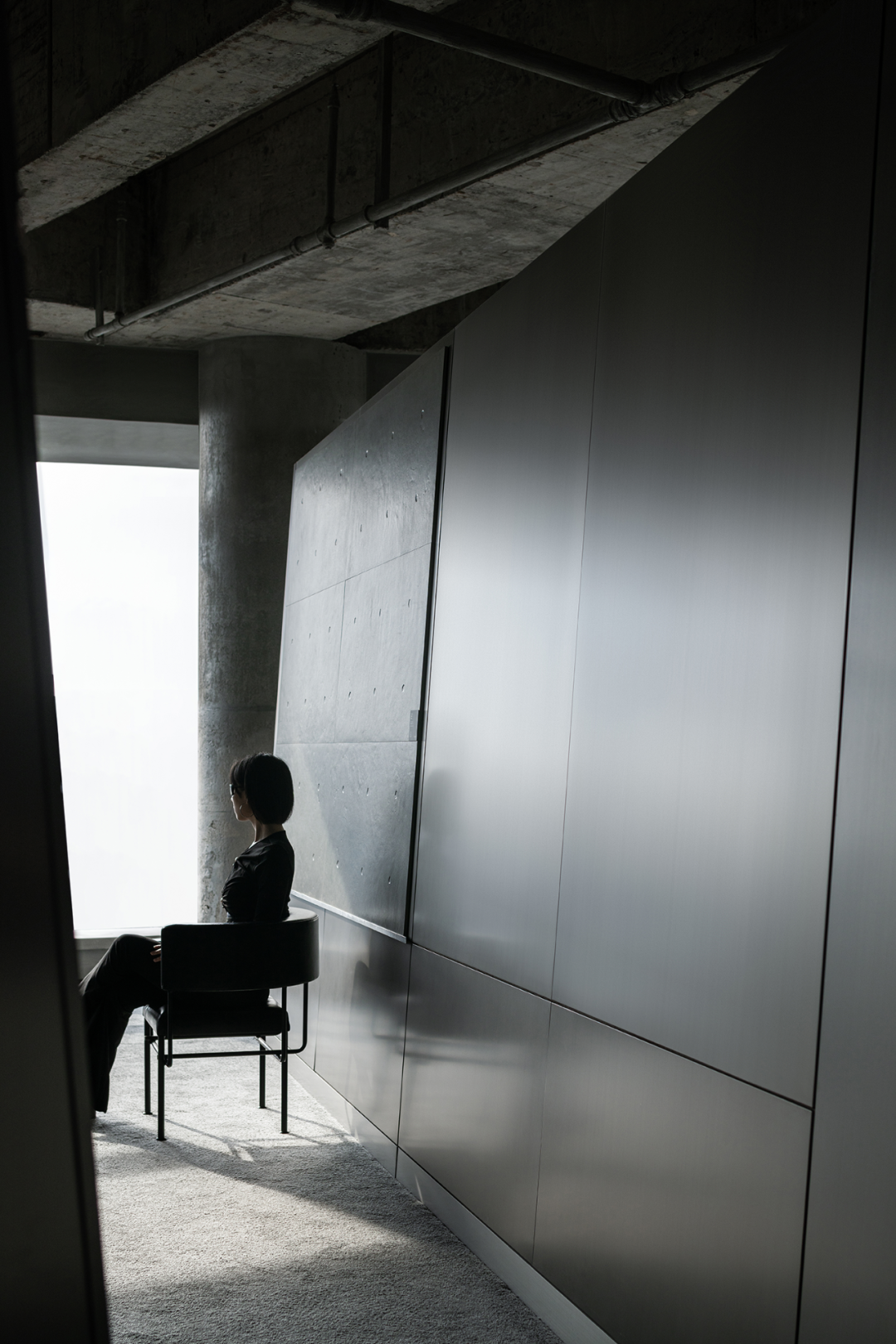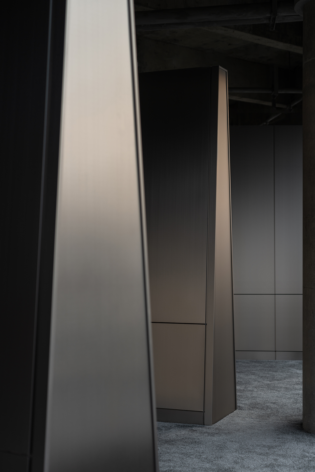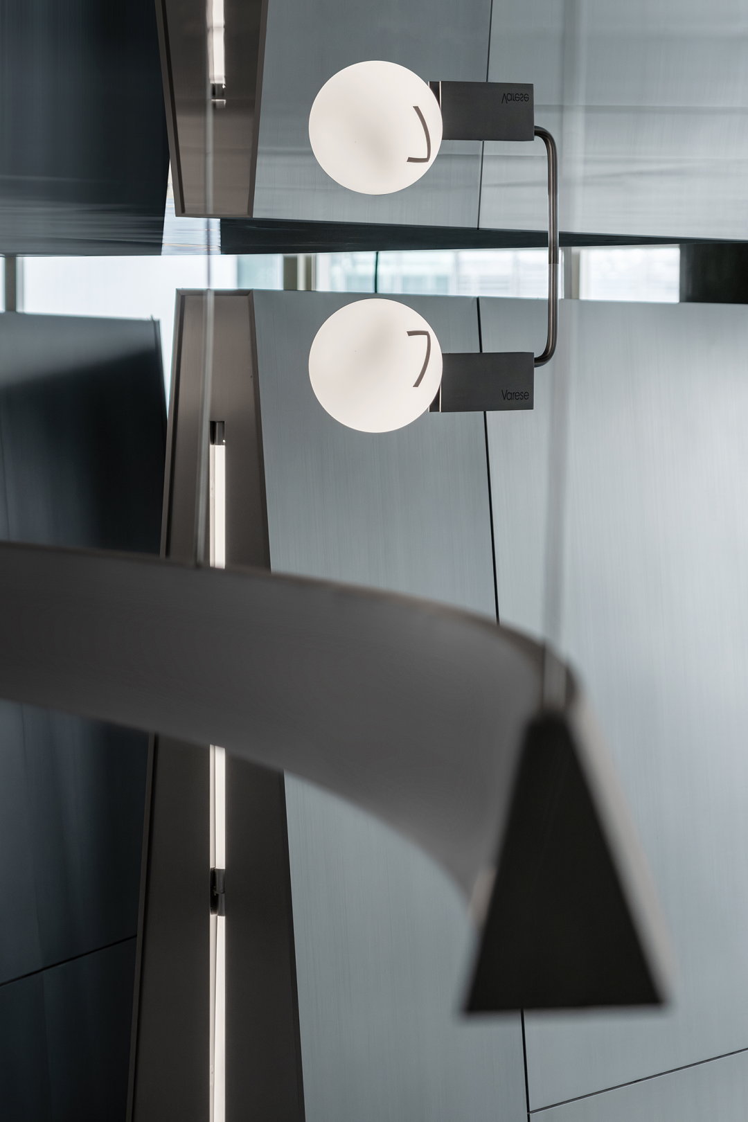 拉丝不锈钢的展示墙上,对应落地玻璃反映进来的自然光,充盈整个展示空间,玻璃窗外折影所出的光影如壁画嵌入,与之融为一体。时而充满张力,时而隐忍,在“弧线”与“光影”之中突出产品优点最大化的设计当中,来访者可在自然光与灯光下感受产品的不同质感。最大程度增加光线,扩大视野,凭依光影与灯光交错的影语构建属于展厅的未来感氛围。品牌方以链接新世代年轻人品味喜好,及其对商品消费的理解作为商业目的,打造新颖的品牌跨界周边产品,与年轻消费者共鸣。产品陈列展示运用台面与立柜之间高低组合、错落有致的设计手法,产生富有趣味的视觉体验。不锈钢材质材料的运用,更衬托出商品的高级感,其包裹性与节奏营造出更深层次的新零售陈列岛台展示区域。“岛台”作为展厅空间中心位置,满足了空间品牌多功能展示周边产品形态,既是所有通道的起点,也是所有通道的终点,以多条行径打通空间中心点的链接。岛台空间打造成新商业零售场景,以“小样车”形式展现品牌创意周边产品。展厅同时设有直播间,以年轻人青睐的线上沟通方式,拓展品牌受众疆域。作为注重可持续发展理念的费罗娜品牌,设计师在展厅整体设计和建造选材中运用了大量可循环利用的不锈钢材料,以及可拆卸并能进行二次循环利用的建造材质,如展示架等产品,体现品牌与设计师共同秉承的绿色环保理念。主要材料|拉丝不锈钢、镜面不锈钢、费罗娜水泥瓷砖、灰色地毯部分品牌|Stellar Works、Magis、B&O、Qeeboo、Vondom、Departo、本土创造BENTU