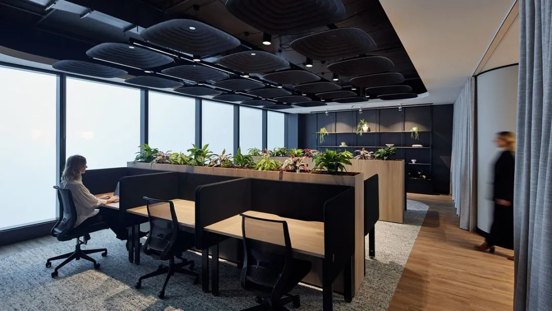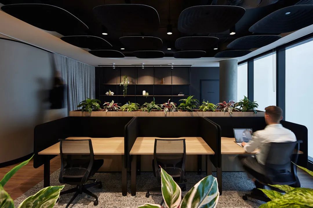 “阅览区”是本案一个独特的空间元素,为员工提供了一处宁静的空间,让大家在此安静的专注于个人工作。这里采用暗黑系配色、朦胧的磨砂玻璃窗、以及声学顶面装饰元件和大量漂亮的绿植,为员工带来积极的感官体验。