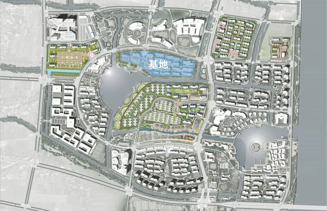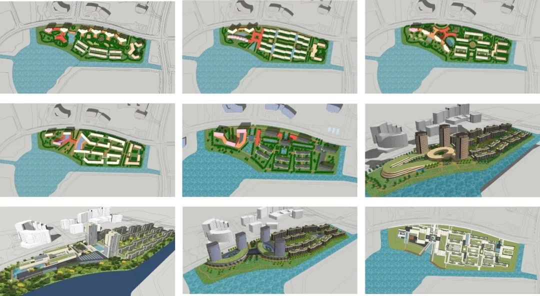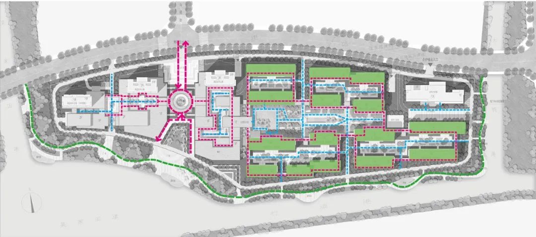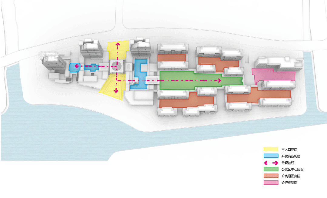 相对开放的养老主题活力街区布置在入口主轴的西侧,老年活动中心、主题商业,水疗中心、餐饮中心、书画室、棋牌室茶道馆、健身房、图书阅览室,咖啡厅、多功能厅等等功能以多重院落的形式依序展开,在沿水岸一侧还设置了一系列灰空间,鼓励形成丰富多彩的外摆商业情景,更好地与水岸生活形态形成互动。