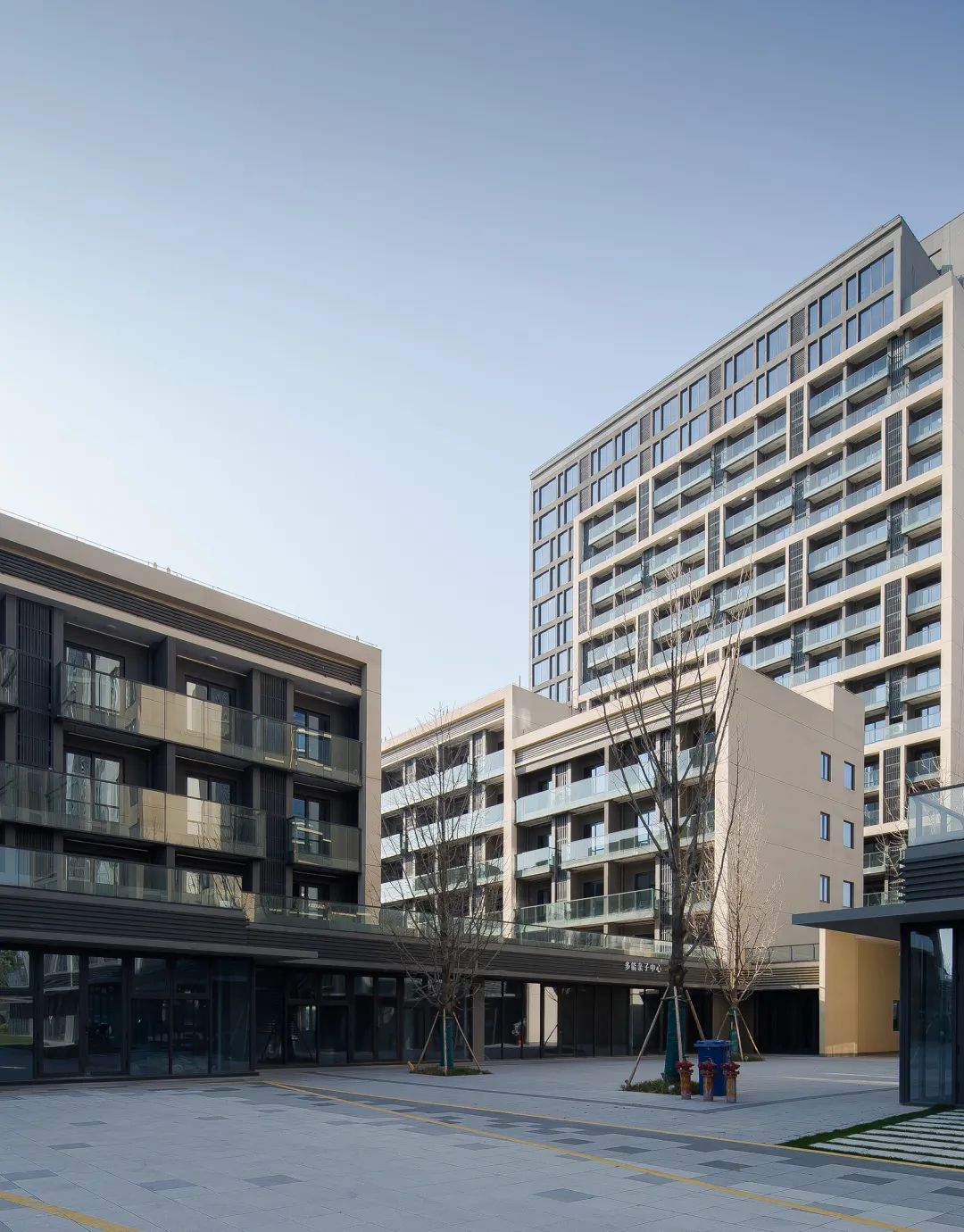 公共配套中心主要建筑围绕三个庭院而成,设计时充分考虑商业街区的开放性,从内街可以方便到达临近的广场或是河滨休闲区;采用灵活生动的街巷+小广场空间的形式,结合主轴线、庭院、风雨连廊的设置,各区域自由连接,申通无阻,满足老年人多层次的需求。