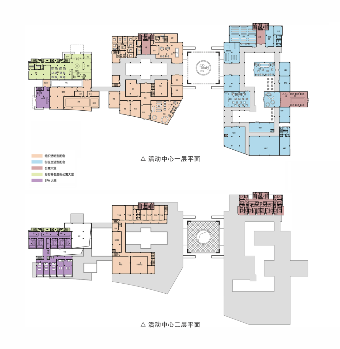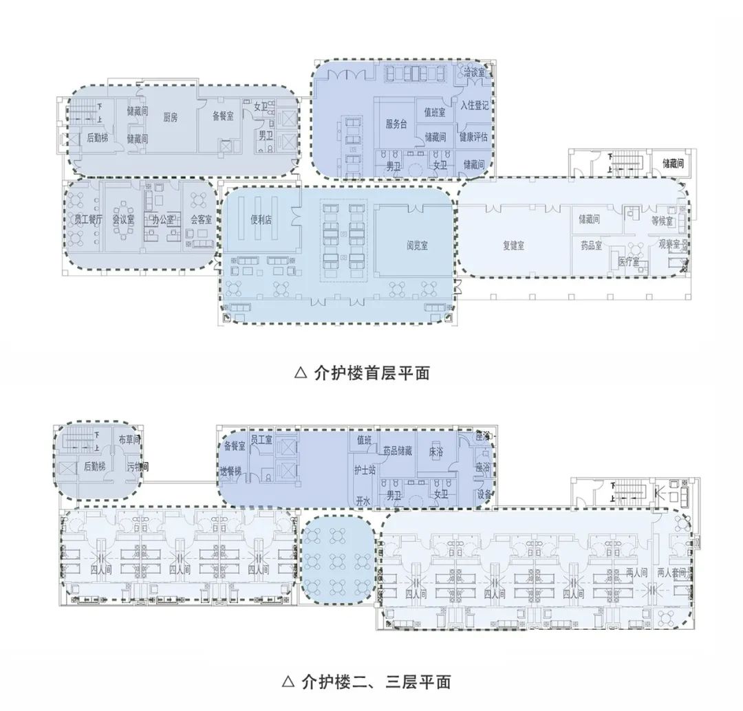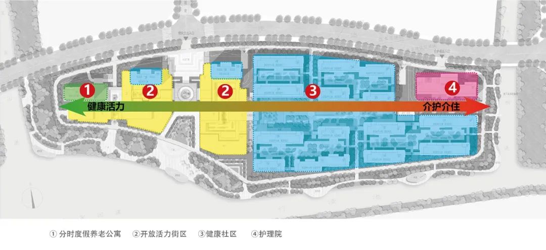 我们考虑了一条东西向展开的功能主轴,由东向西依次为适老型酒店区(短期入住)、度假型老年公寓(中期)、服务型老年公寓(长期)以及护理院。依据客群健康程度的不同分别对应了护理服务需求程度不同的具体功能。
