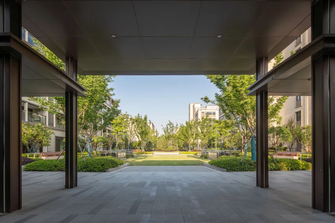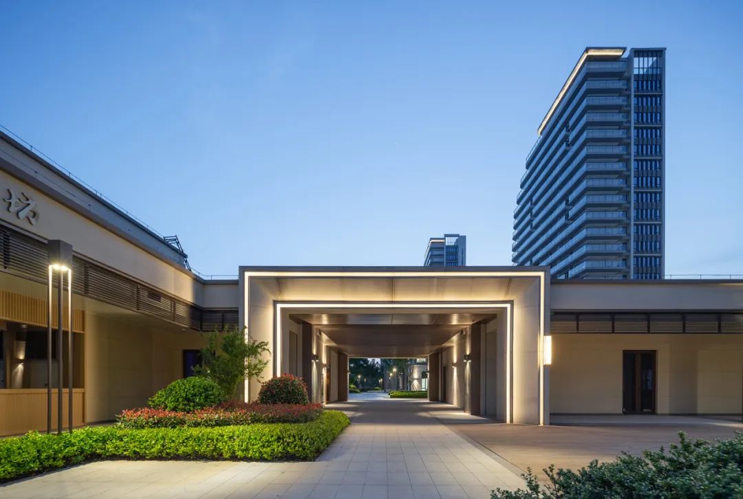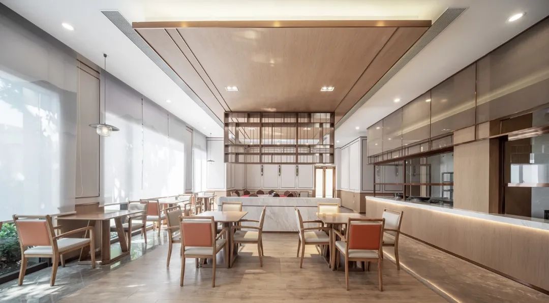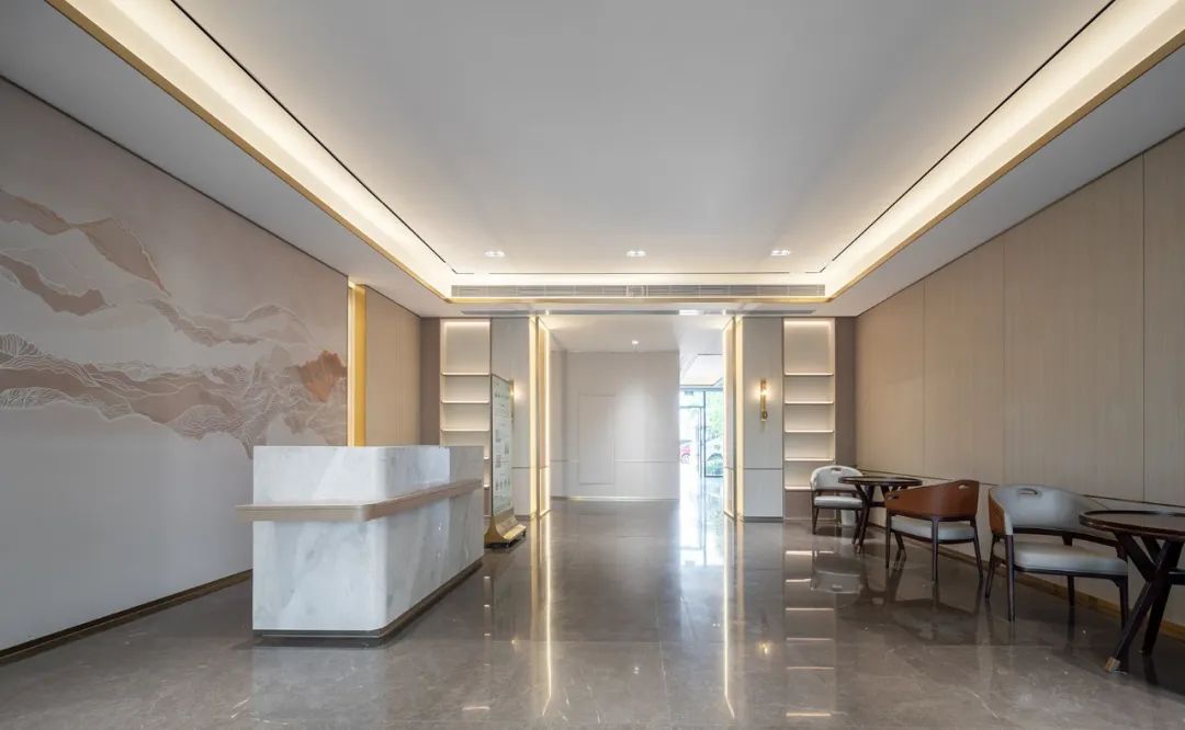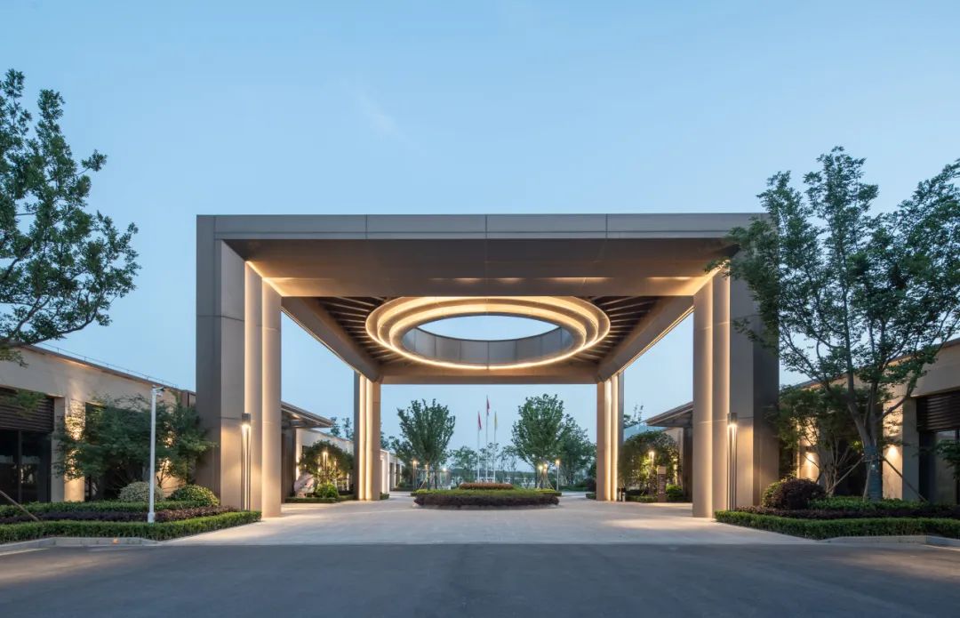 两条轴线的中间交叉点是整个项目的空间和形象焦点,我们在这里设计了一个超尺度的灰空间,担负起整个项目的落客区功能,方中套圆的形态,适度轻奢的材料选择,都比较好的体现了颐养中心作为太湖健康城综合配套中心的地位和作用。