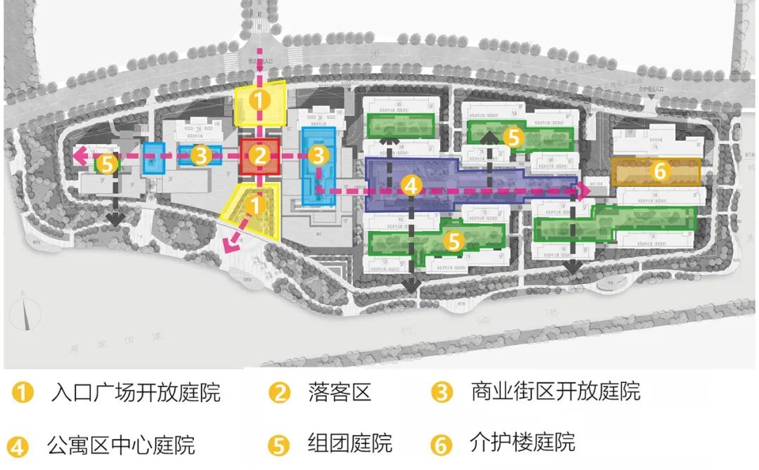 规划根据项目的老年社区特点,以多层次的围合式庭院为起点来规划整个空间,形成一心两轴两区九庭院的规划结构。