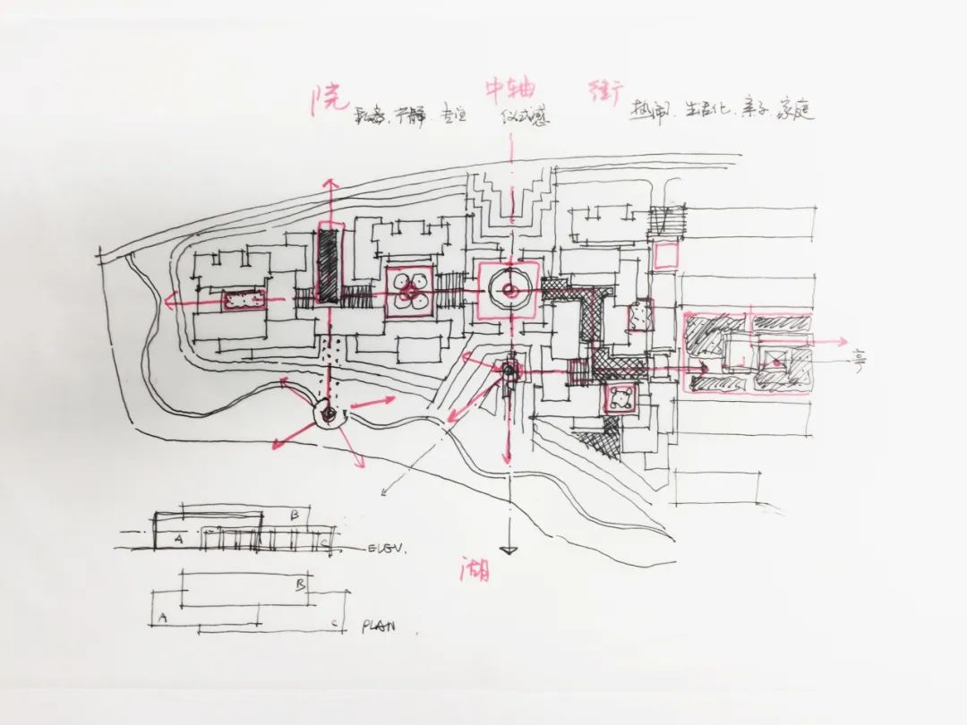 我们把社区的主入口设置在开放程度不同的几组功能之间,并由此形成一条直达基地南侧湖畔的礼仪主轴,以最为简洁有力的方式沟通了城市与水岸空间它与东西向的功能轴互为十字交叉,一起构成了整个颐养中心的空间体系。