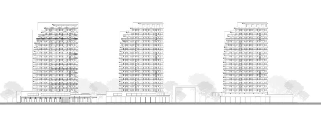 经过十数稿的方案比选和不断优化,最终我们提交了“太湖扬帆,银龄启航”的立面方案。具体来说,方案以三栋点式高层形成带有韵律感的三片风帆,带动低层公区和多层公寓强调水平舒展的体型,犹如流线型的船身加以承托,使整个建筑群形成一个整体,矗立在太湖之滨。