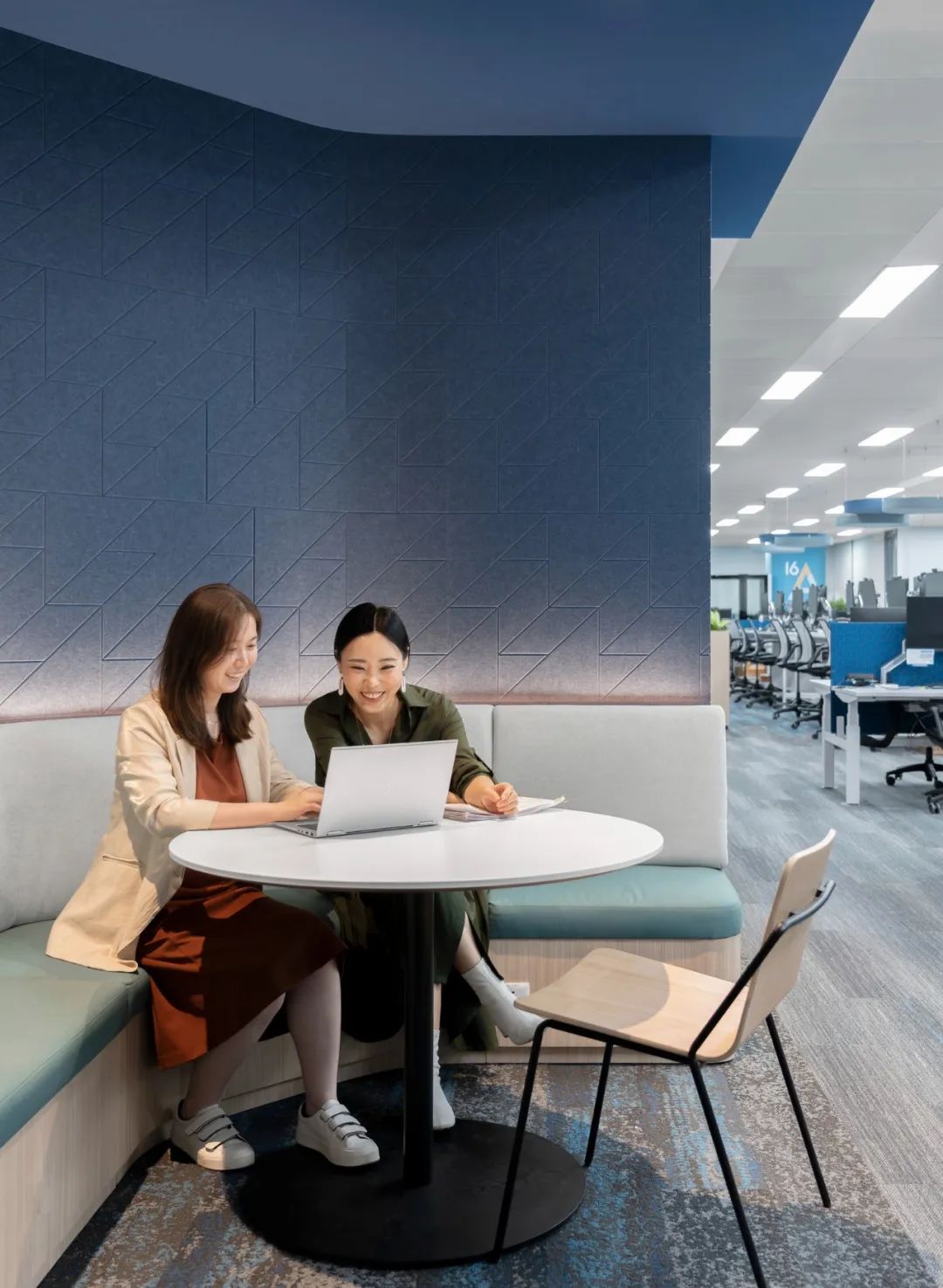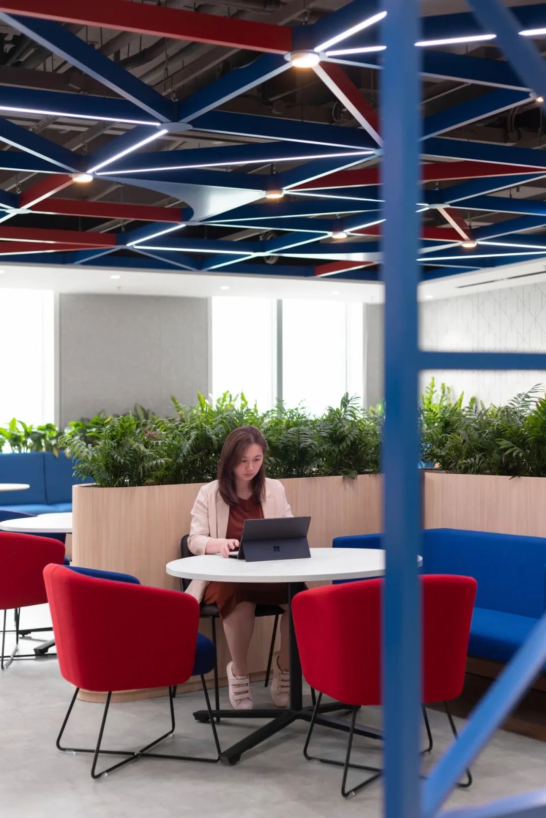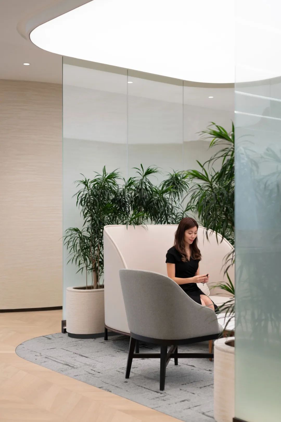 “创新”元素的融入体现出“多元、包容、动态”的体验原则。除传统工位外,任务区包括了临时办公区、开放式工作舱、即兴协作区、专注舱和静息空间,以适应不同的工作模式和需求。员工透过数字导视系统和移动应用程序,可获取工位实时使用及在线预订情况,从而提升工作效率。