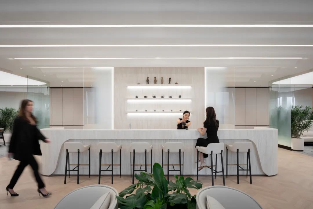 空间设计呼应渣打银行“Twice the Experience”和“SC Foundations”品牌书中规划的发展愿景:提供最佳客户旅程,强化渣打银行作为杰出雇主的声誉。因而,空间内部独立工作区、团队协作区和社交区平衡布局,充分响应混合办公模式,满足不同业务和功能的需求。任务区和会议室散布在所有五个楼层,供员工灵活使用;16层的公共空间和28楼重新构想的接待区,则可供员工及访客会面,或享用餐点、放松休息。
