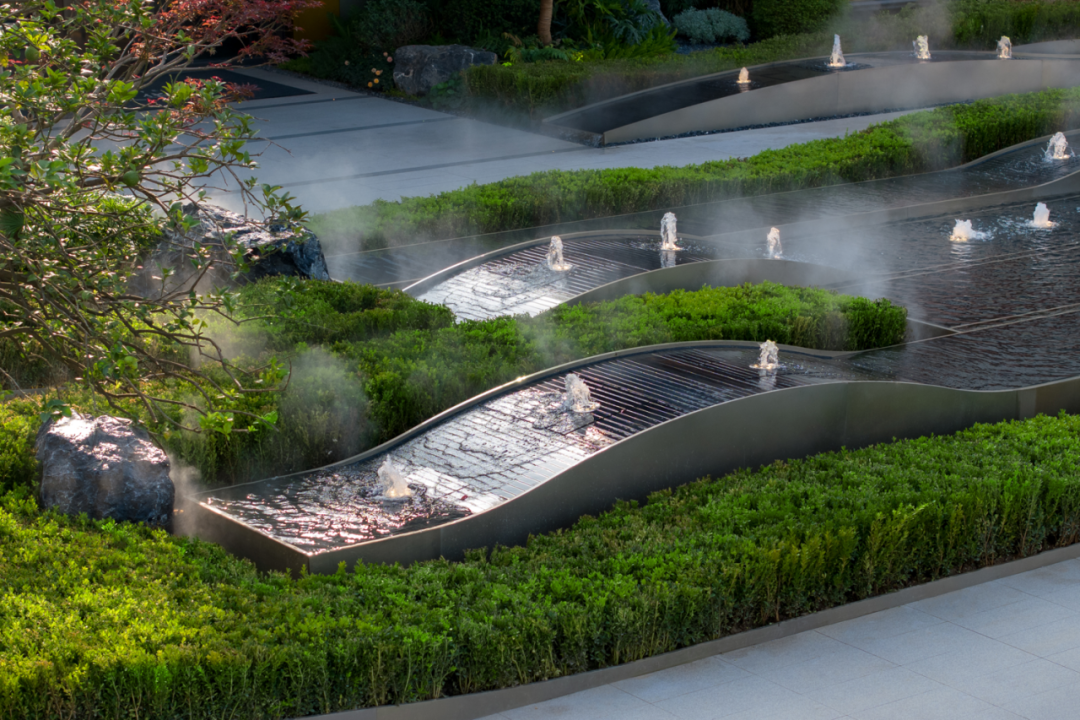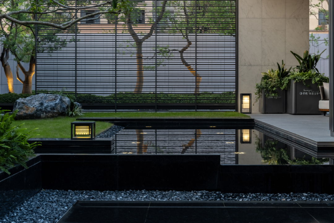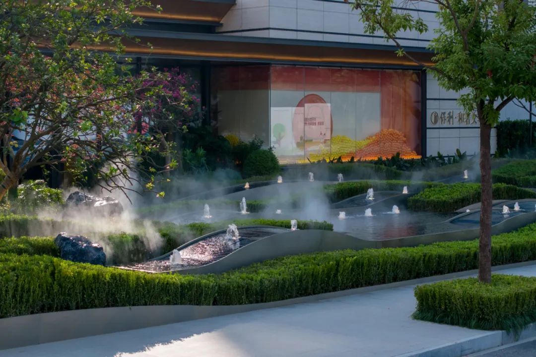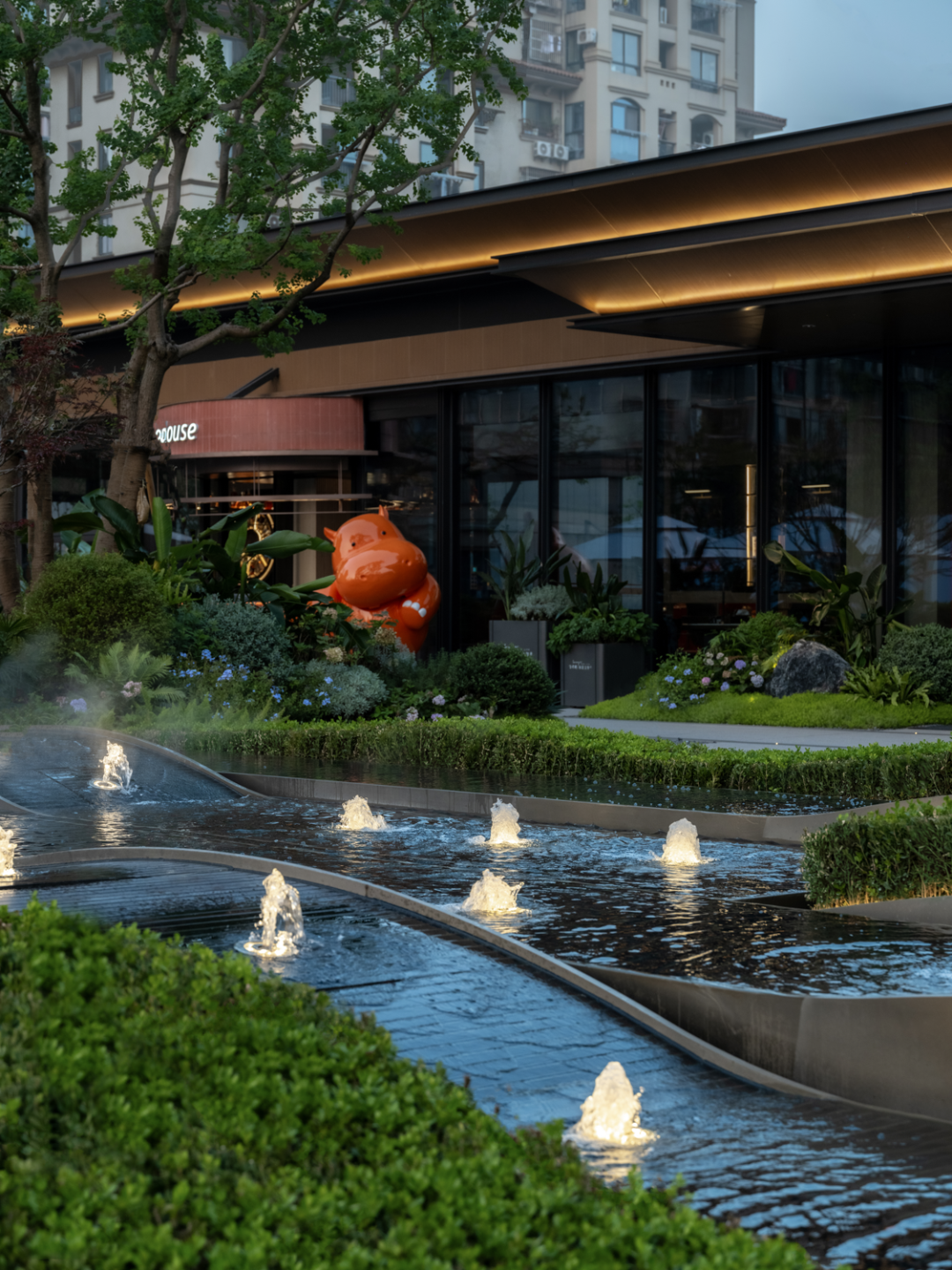 在本案城市界面设计中不同于以往项目打造,本次我们采用“引力橱窗”策略,前场延续运河“水流浮力”符号运用到场地水景设计中。记忆中的杭州应水而润,因运而生,融合场地绿植交相辉映打造起伏重叠的“灌木丛浪”,身处其间,自然的绿意扑面而至,仿若川流不息的千年运河文脉丛生,跳跃的水波,灵动的浪花,在阳光的牵引下邂逅“日暮林熹”。