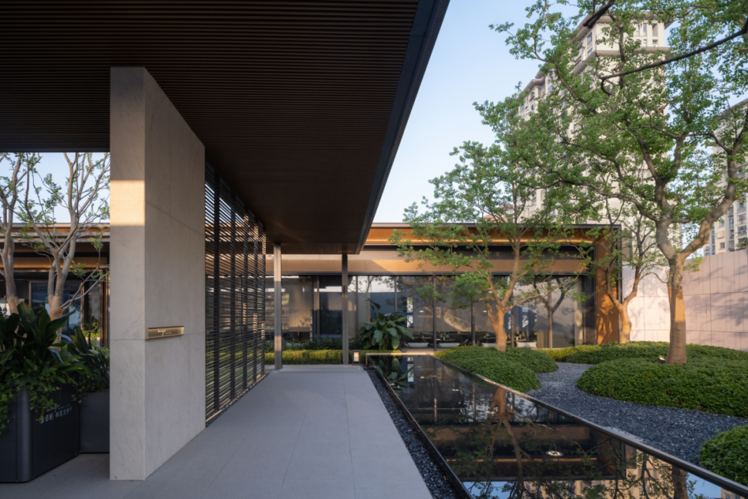 In this case, the urban interface design is different from the previous projects. This time, we adopted the strategy of "gravitation window", and applied the symbol of "water buoyancy" of the frontcourt continuation canal to the site waterscape design. The remembered Hangzhou should be moist with water, born with luck, and blend the performance of the site to create a "brush wave" with ups and downs. In the meantime, natural greenery came to our face, just like the endless Millennium Canal with numerous contexts, jumping waves and waves.