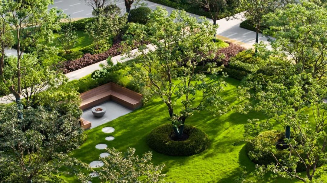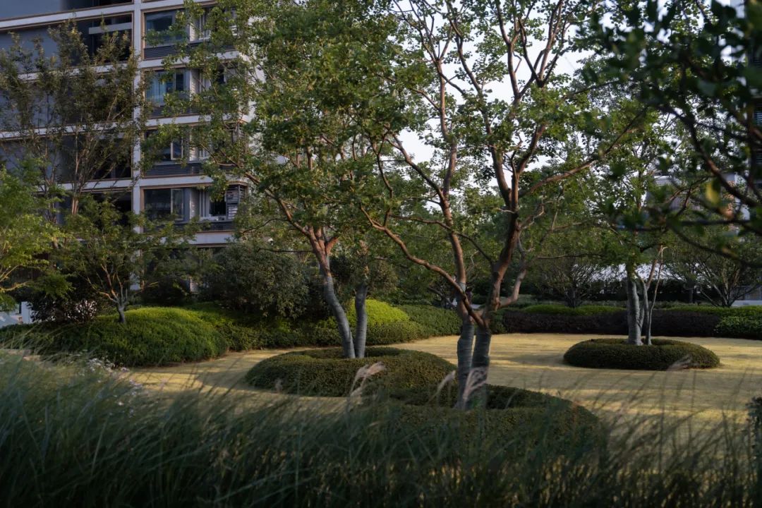 中央花园的西侧草坪片植乌桕林,让人仿佛置身于一片茂密的绿洲之中,乌桕天然的色叶属性,也可让人在秋日欣赏层林尽染。