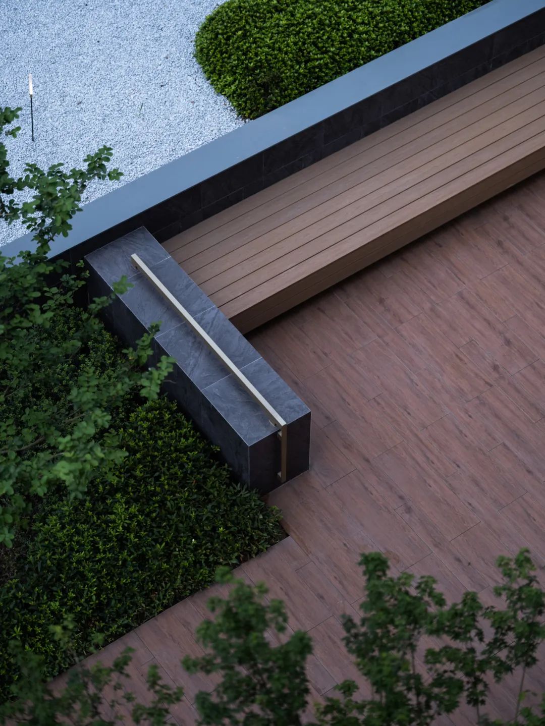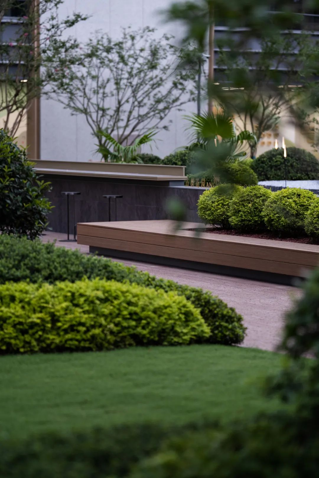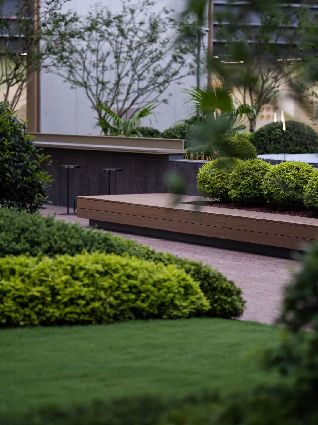 我们保留原场地古树的同时,融入植物认知的功能,结合场地高低错落的地形起伏,创造了一个围绕古树的互动剧场,温暖的木色与雕塑感十足的灌木球相互映衬,和谐共生,认知、休憩、交流、分享等各种行为活动都可能在这里发生,我们尊重古树的同时也运用现代设计手法,将古树融入全区场域精神之中,将场地记忆的延续与传承。