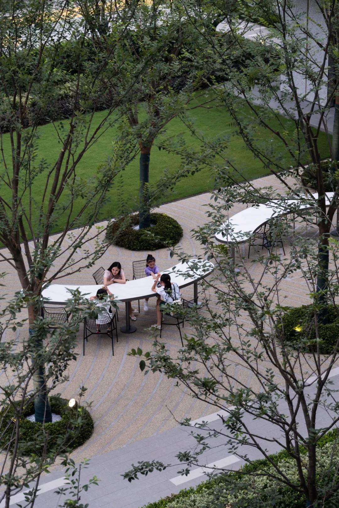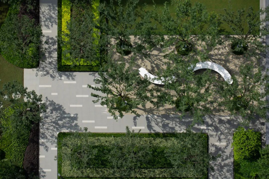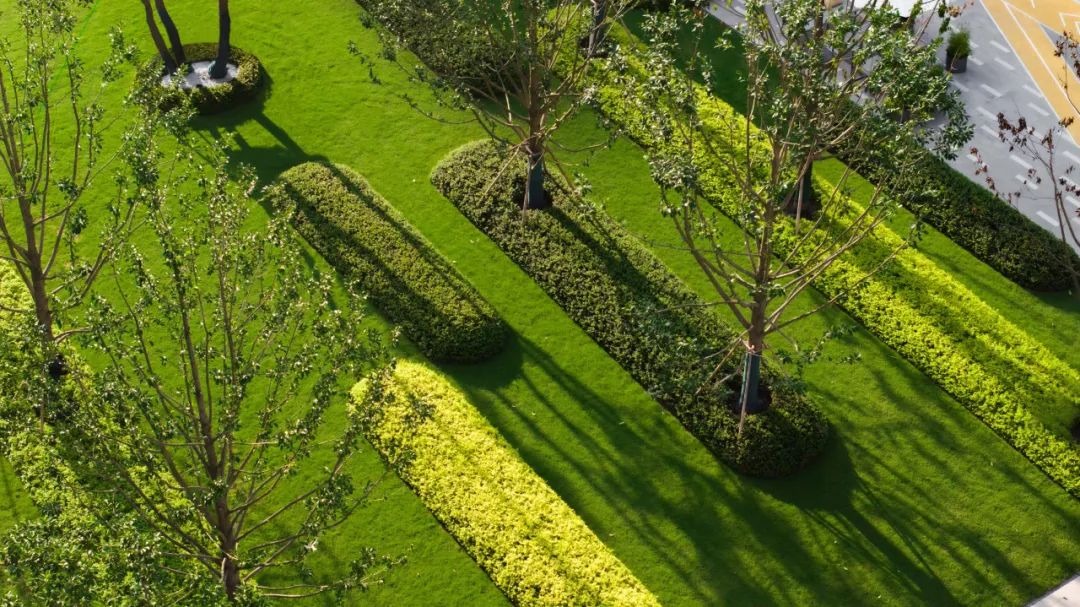 坐落在园区中心的中央花园,将静谧与活力巧妙地交织在一起。这片草坪如阳光之海,将东西两侧相隔近200米的动静空间连接起来,实现了园区景观的价值最大化,同时也将"公园"的魅力融入社区生活。这是一个多功能的都市会客厅,也是通向林间画廊的绿色链接,充满着活力和趣味。