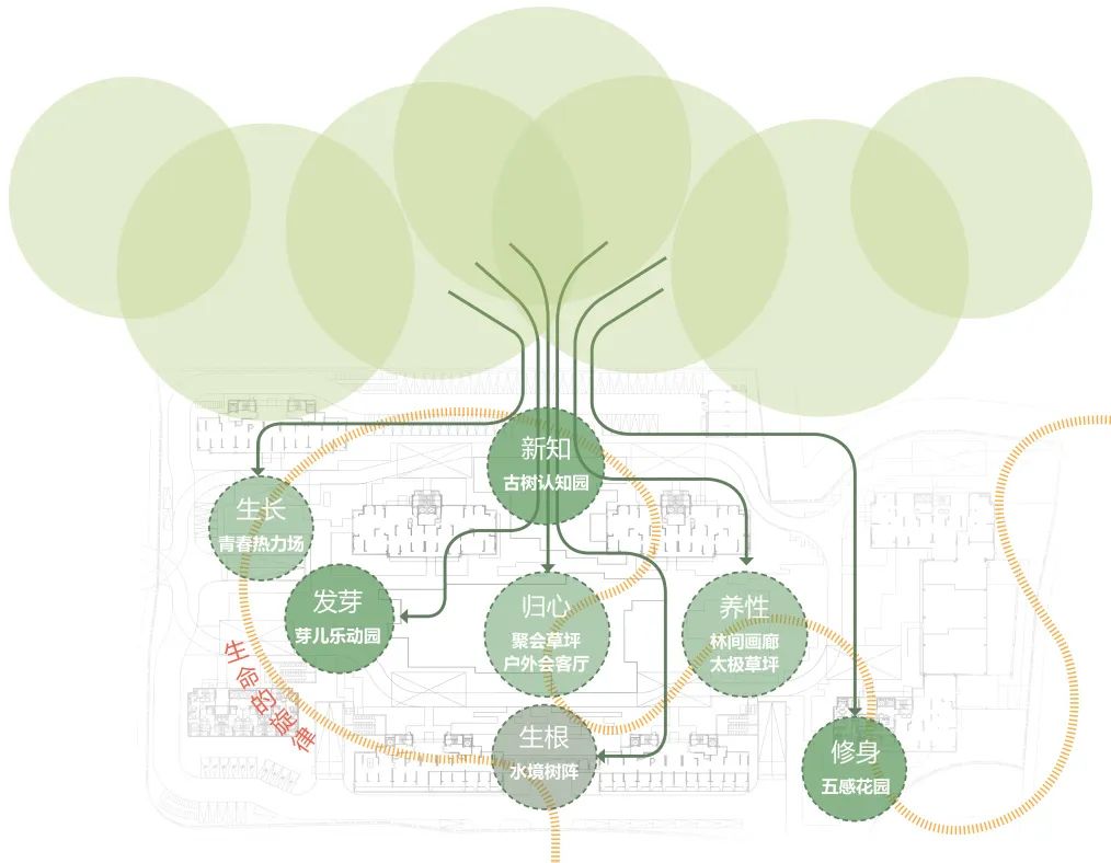 园区以“古树故事”为主题,将古树的生长脉络比拟人生不同阶段,从而在空间上映射到园区的不同功能。古树的生长周期从萌芽、茁壮逐渐走向成熟,仿佛在诉说着人的一生从烂漫懵懂、探索新知、到沉淀感悟的过程,不同年龄段的人都可以在此寻找属于自己驻足之地,逐步带领我们探索社区的记忆。这里不仅见证了古树的成长之旅,未来古树也将守护着我们的每个生活场景,传递着社区的温情。