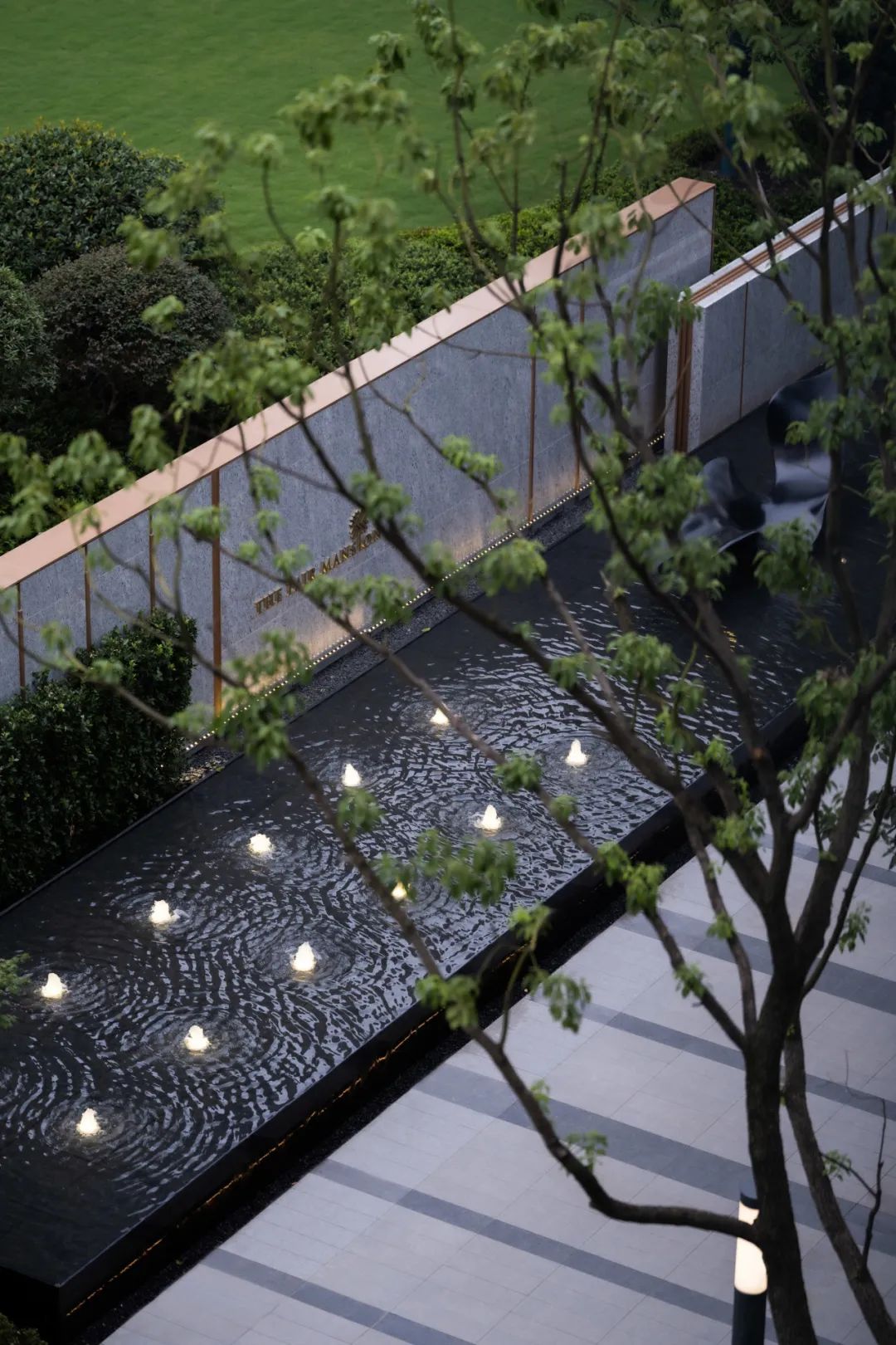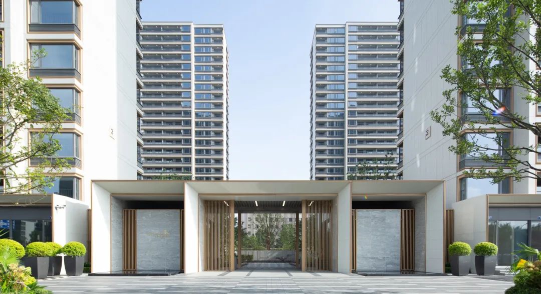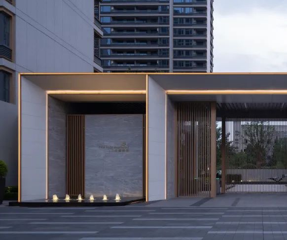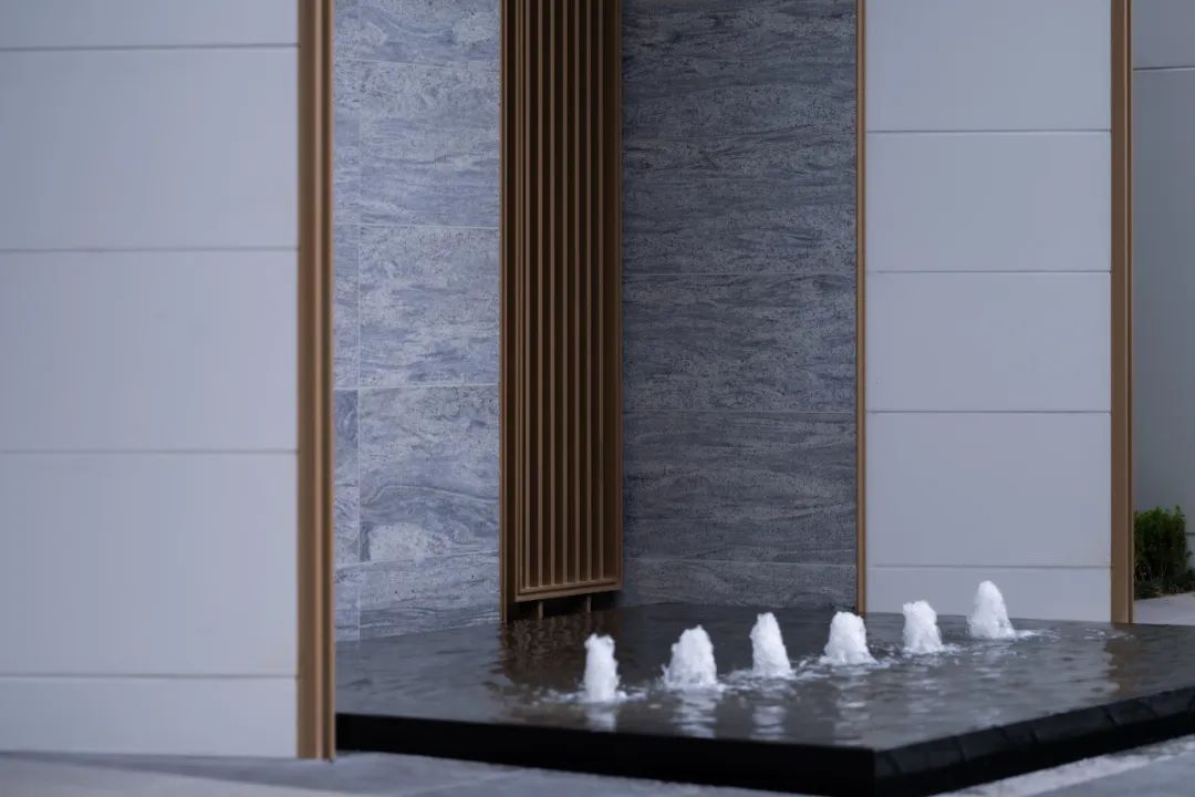 南侧礼仪入口体块延续建筑语汇,以立面干净的暖白色石材为框架,配以金属格栅作为装饰,园内花园景色在此若隐若现,立面上呈现一体化的界面形象。石材细节配以“金线”勾勒,质感与色彩的碰撞尽显雅奢之境。水泉涌动,潺潺流水打破了些许沉寂,居者在此刻卸下一天的繁忙,感受这份宁静,体验酒店式归家仪式感。
