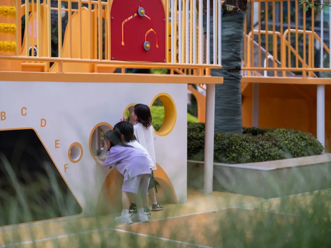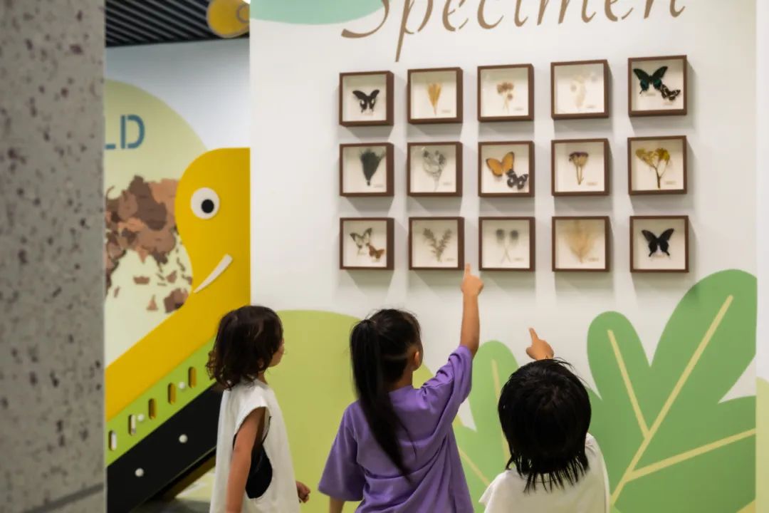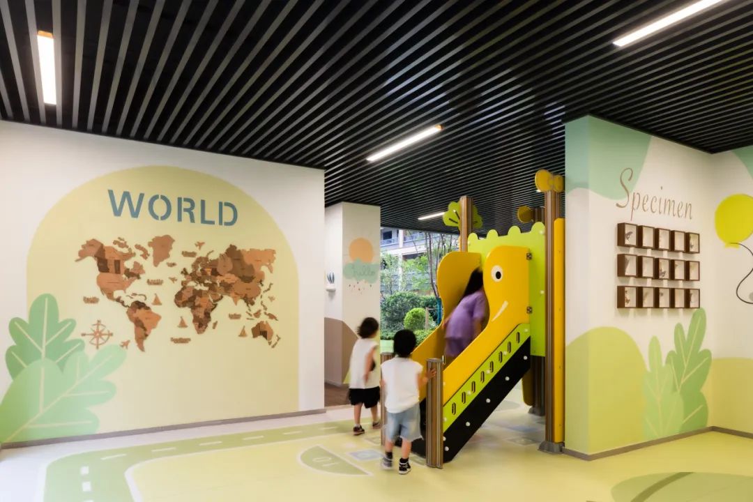 “邻里+、童趣+、颐享+、动力+”四大架空层空间与社区内的生活场景内外相互呼应,犹如一曲和谐的交响乐章。在这四大架空层空间,室外的欢乐元素得以延续,而墙面上点缀的蝴蝶标本和世界地图,则唤起了孩子们对这个世界的探索欲望和求知渴望。这里不仅是一个融合了亲子互动和儿童乐园的综合场所,更是室内与室外互通的纽带。