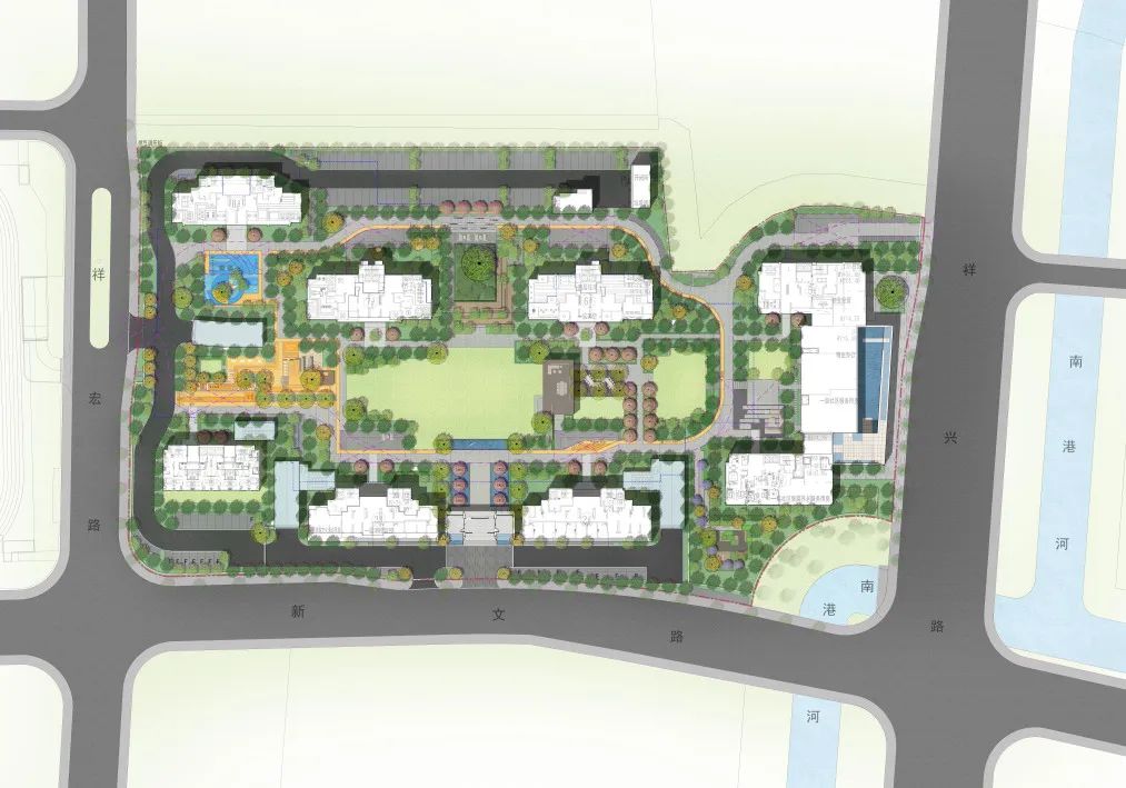 在架构上,景观打造“一心绿满园,两轴承万象”的空间结构。项目充分利用建筑围合后的中央花园空间,以此为核心,形成两条功能轴线,南北轴线以南侧礼仪入口为起点,北侧新知花园为终点,打造礼仪观赏轴;东西轴线则是动静结合的生活轴,东侧以高品质静态空间为主,包括共享会客厅、林间画廊、阅读花园、五感花园等功能;西侧以活力动态空间为主,包括儿童、青年、老年等全龄段的运动空间。