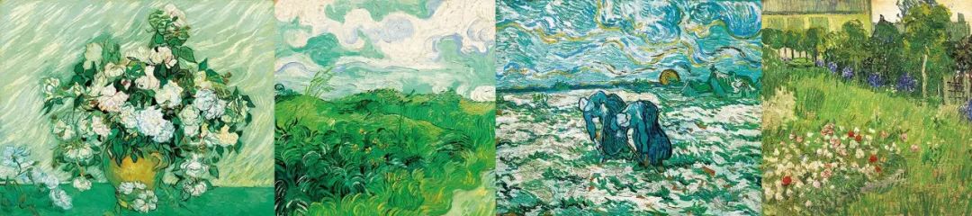 在风景画中常用到铅白、镉黄、翠绿、普兰、钴蓝,来描绘天空、水面、草地、植物等来表现自然景观。面对《开花的苹果树》、《玫瑰》、《绿色的麦田》画作中的诚挚、浓烈、热情穿越时光,感染所有凝视的人,以思维完善光与色,将色彩和光感揣摩到极致。