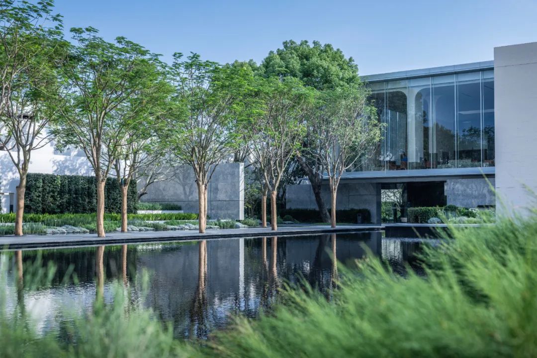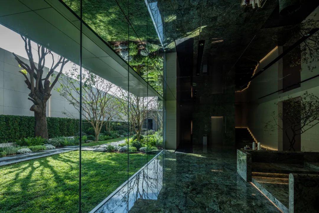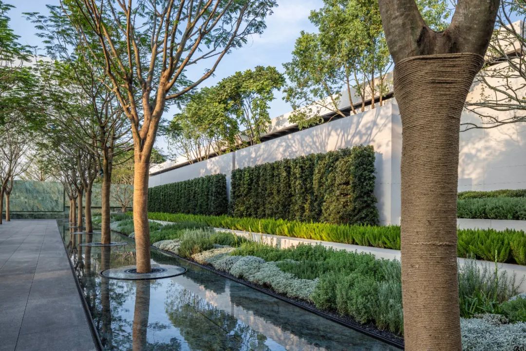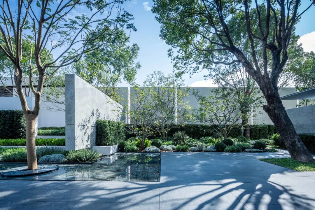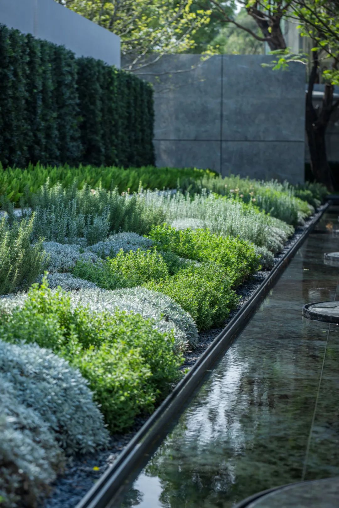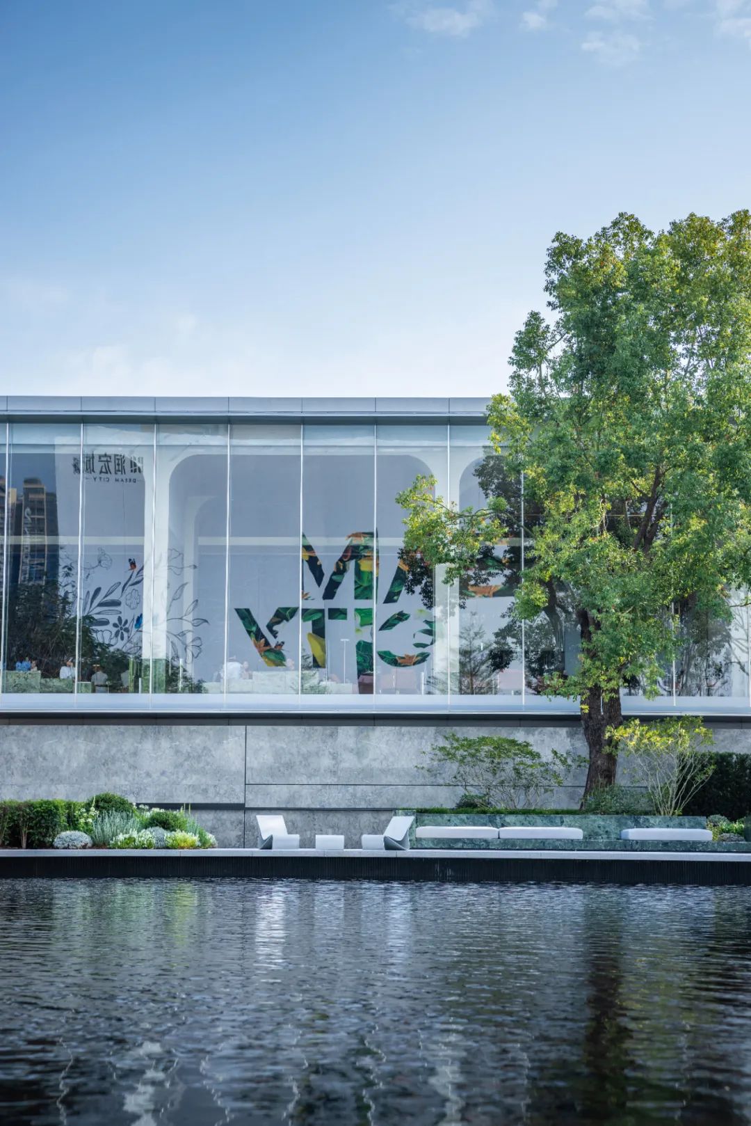 花园的设计结合城市展厅的设定,景观为展场,花园为展品。礼仪轴线、迎宾通道、大树客厅、后场花园形成了流动的叙事性展览空间,景观空间如同美术馆的白盒子,植物以「艺术品」的方式呈现出来,温润的宝格绿和灰调的海洋蓝,通过几何奢石墙面的切割,让空间留白;印象派的灰绿色彩与光影的变幻,还原自然定格经典。