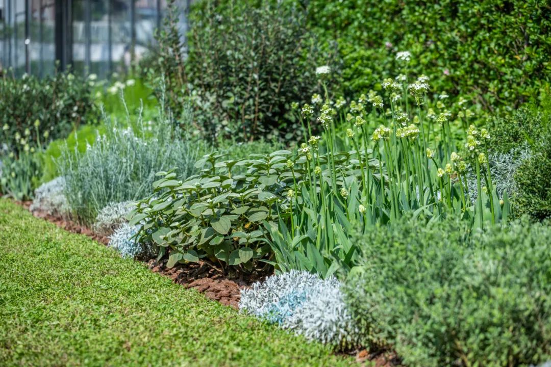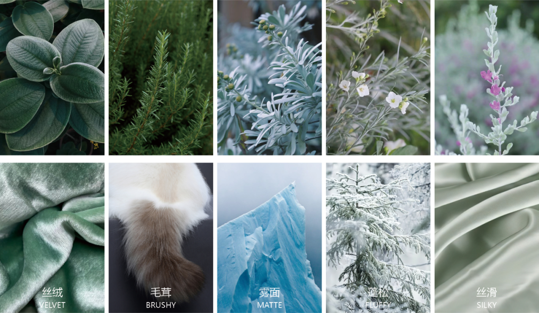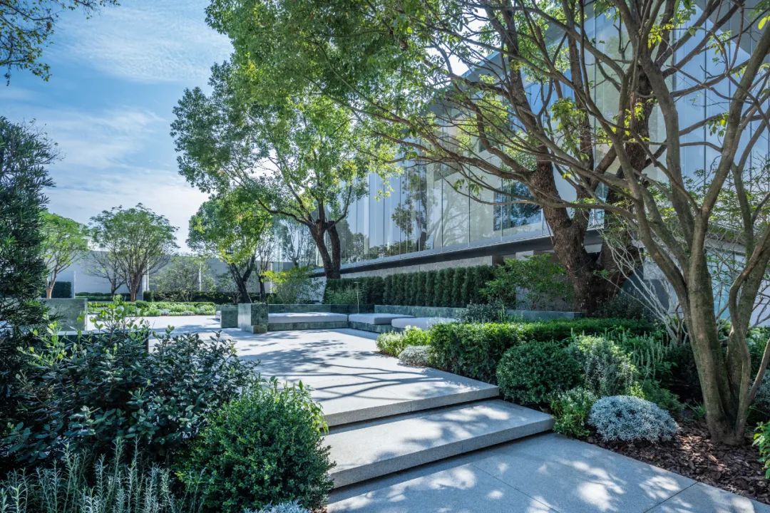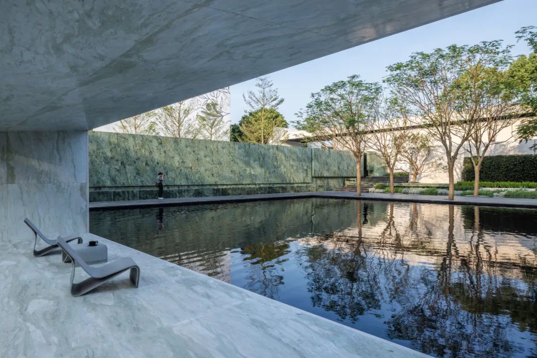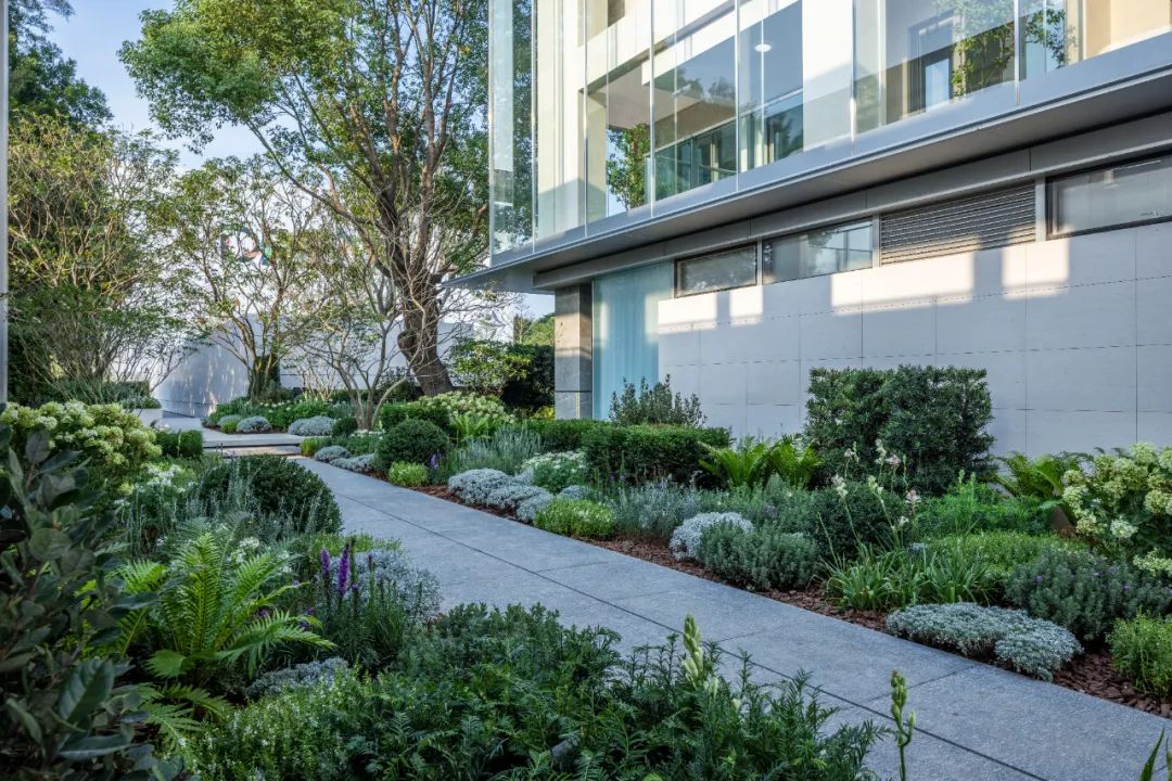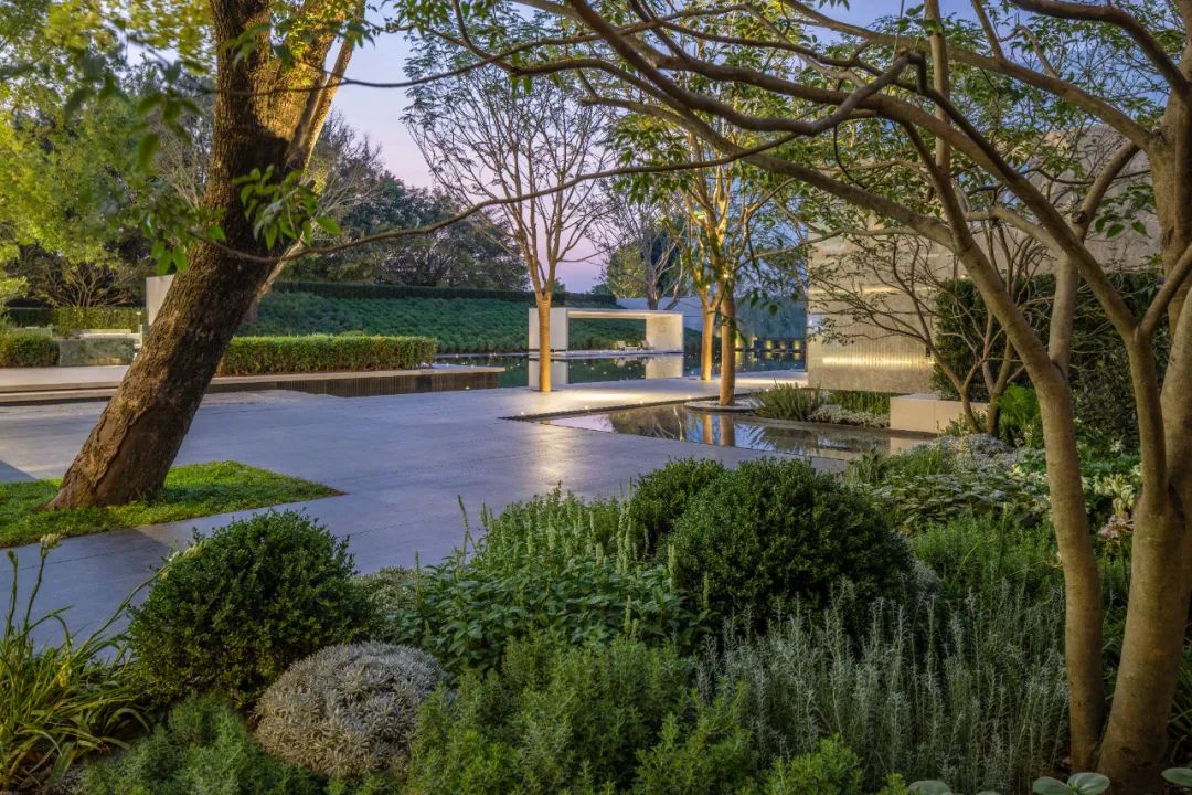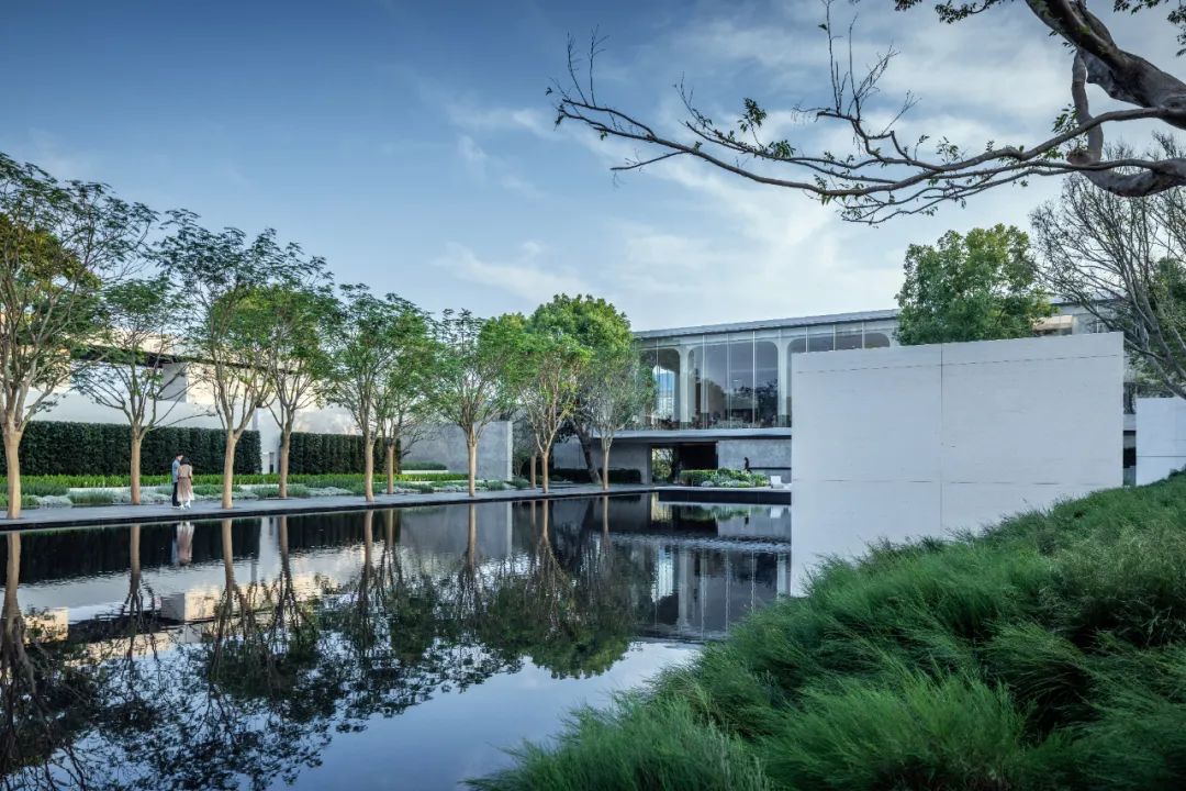 花园的设计结合城市展厅的设定,景观为展场,花园为展品。礼仪轴线、迎宾通道、大树客厅、后场花园形成了流动的叙事性展览空间,景观空间如同美术馆的白盒子,植物以「艺术品」的方式呈现出来,温润的宝格绿和灰调的海洋蓝,通过几何奢石墙面的切割,让空间留白;印象派的灰绿色彩与光影的变幻,还原自然定格经典。
