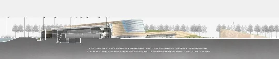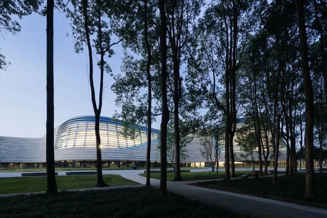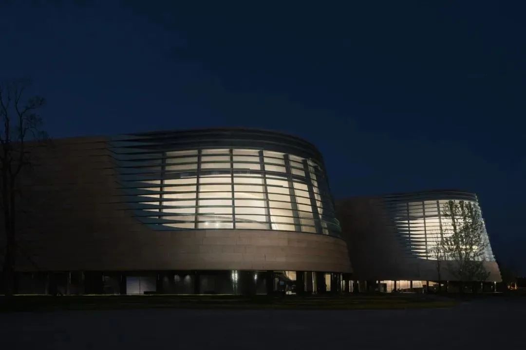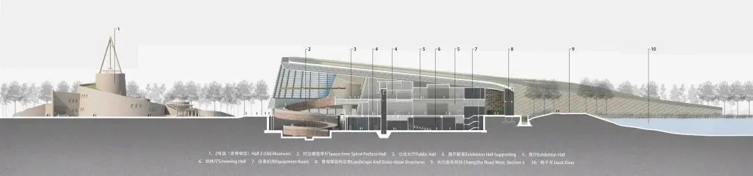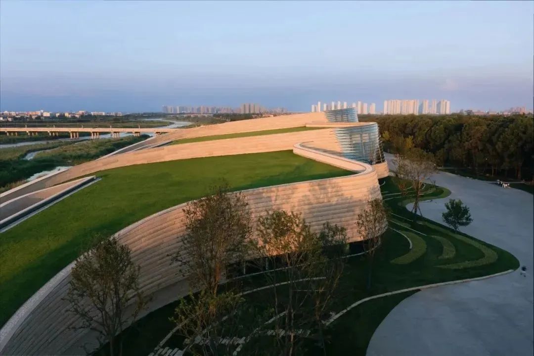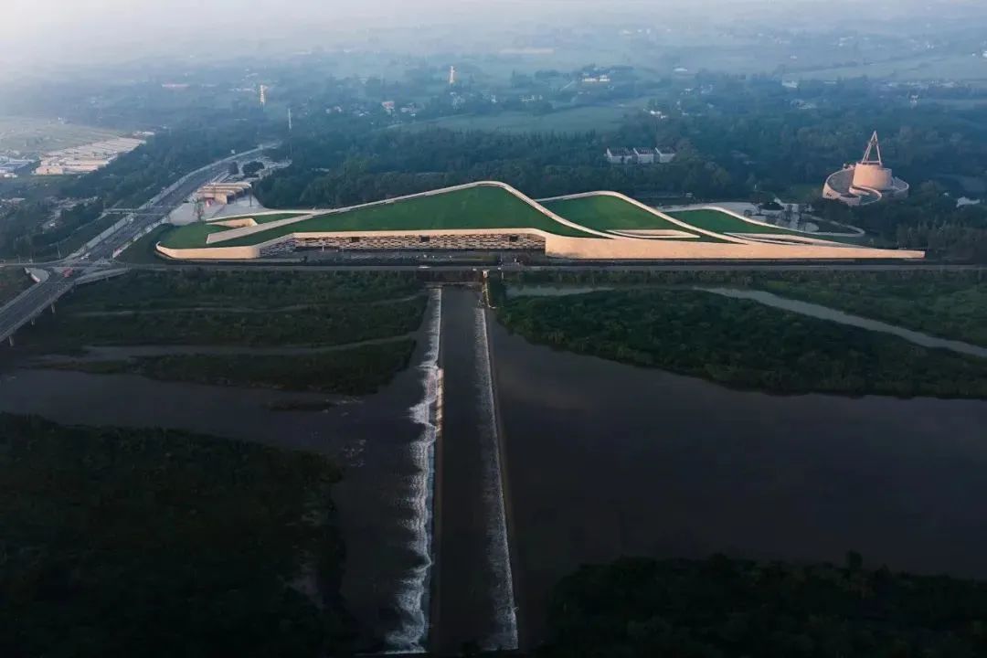 堆体建筑的几何曲面源自于2号老馆,作为中轴线尽端的园区制高点,2号老馆是三星堆著名的历史地标,是前辈建筑大师郑国英先生的代表作品。设计将老馆经典的螺旋外墙向外延伸,作为三个堆体外形和空间的控制曲线。堆体屋顶采用斜坡覆土,朝着北侧河岸方向缓缓下降,融入河堤;也与园区中轴线对面的1号馆的斜坡形体左右呼应。