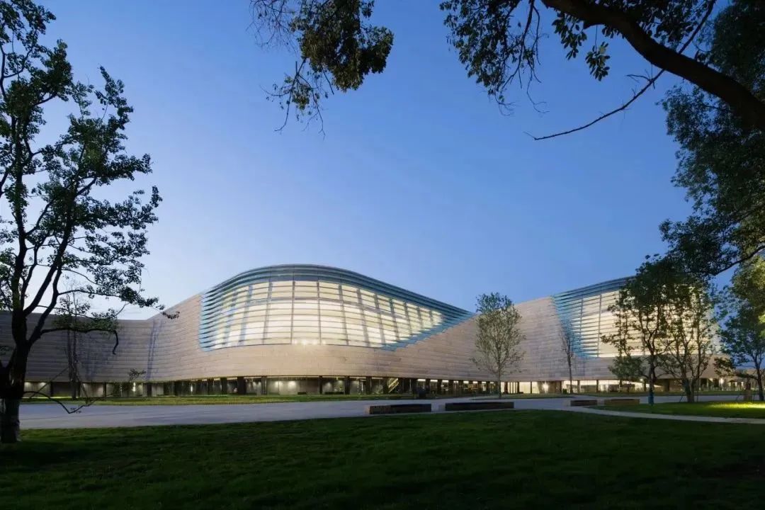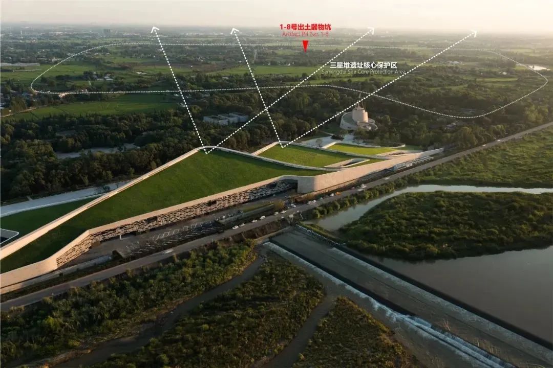 在这样大尺度的场地环境中,建筑被构想为一片隆起的地景——三个连绵起伏的堆体,作为地形学意义上的呼应,也是对遗址文脉的回应——古蜀王国遗留下来的三个堆状遗址和新月状的月亮湾台地,形成“三星伴月”景观,“三星堆”由此得名。