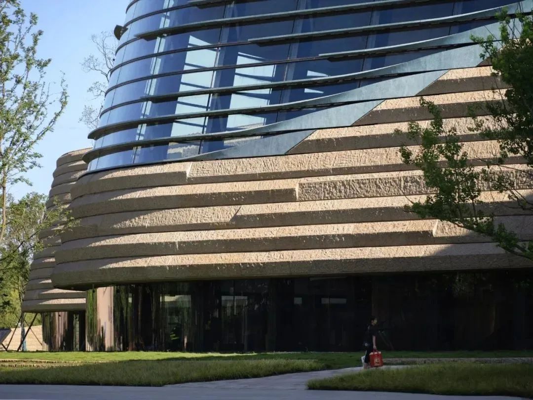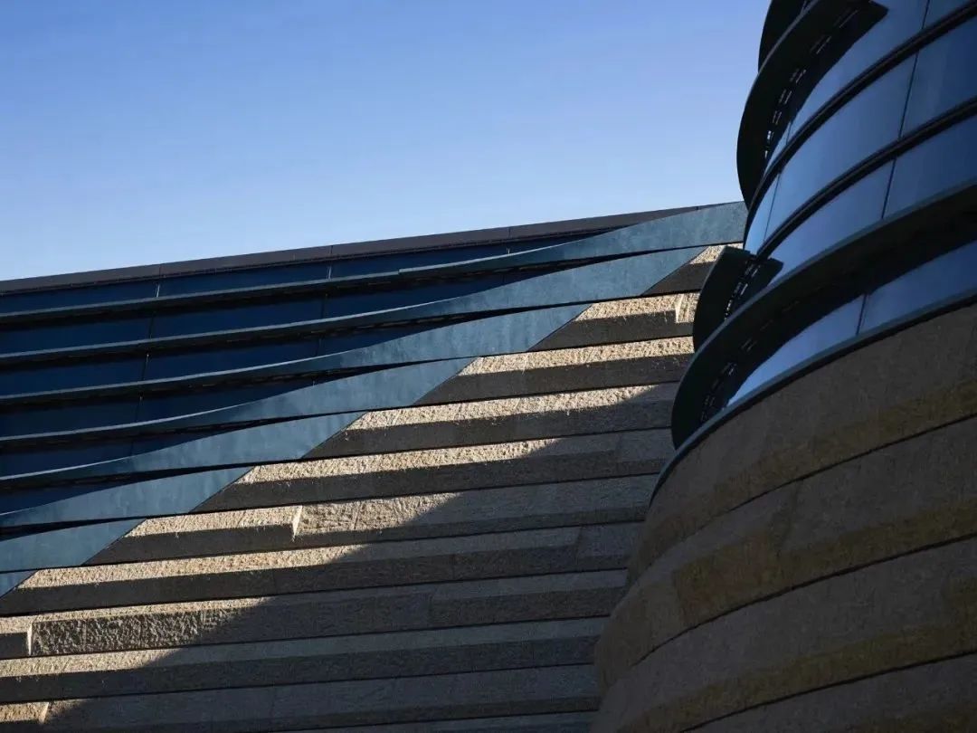 新馆的外观材料追求独特性与唯一性,使用了象征土地色彩的“菊花黄”花岗石。堆体表面覆盖的石板厚度达到8公分,板面采用人工手凿工艺,质感粗犷厚重。“眼睛”位置安装超白玻璃,外侧安装青铜材质的遮阳板,由黄铜板通过特殊的氧化工艺加工而成,模拟出土文物青润斑驳的肌理,暗示三星堆青铜文明的身份。