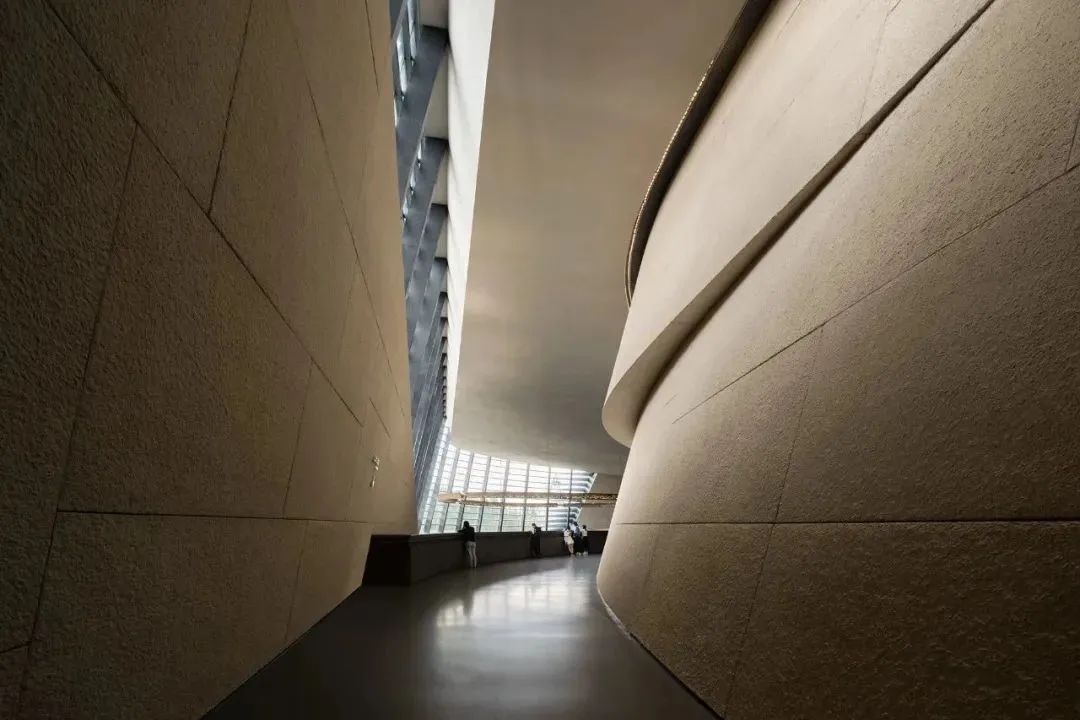 堆体外墙上的巨大眼睛赋予立面生动的表情,也是室内空间的采光口,将侧向自然光带入到馆内深处,渲染出由明至暗的退晕,刻画出空间的深度,营造幽暗神秘的氛围,为此公共大厅天棚取消了全部的照明灯具,仅在墙面和顶棚交接的位置留下洗墙灯带,日光成为空间的唯一主角。