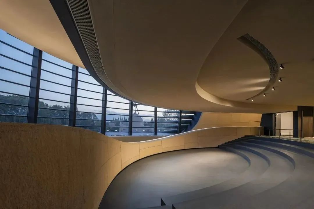 另一处重要节点是二层边庭边上的开放式剧场,正对着2号老馆和遗址区方向。剧场是公共空间里一处台阶下沉的区域,可以举办表演、讲座、展览等临时性活动,是馆内最具活力的空间。从剧场外墙上巨大的“眼睛”望出去,2号老馆和茂密的树林映入眼帘,通过框景的设计建立起新老馆之间的对话。