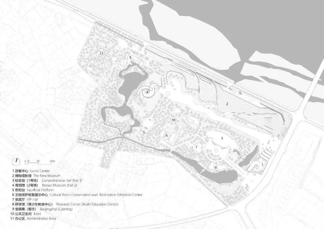 现有博物馆园区是1997年建成开放,面积约530亩,建成的 1号与2号展馆,规模合计仅1.1万平方米,已无法容纳新文物展示和不断递增的游客数量。新建主馆及游客中心总面积54400平方米,主馆将承担全部文物展览和游客导览功能。现有的1、2号馆未来将改造为数字馆和研学教育中心。