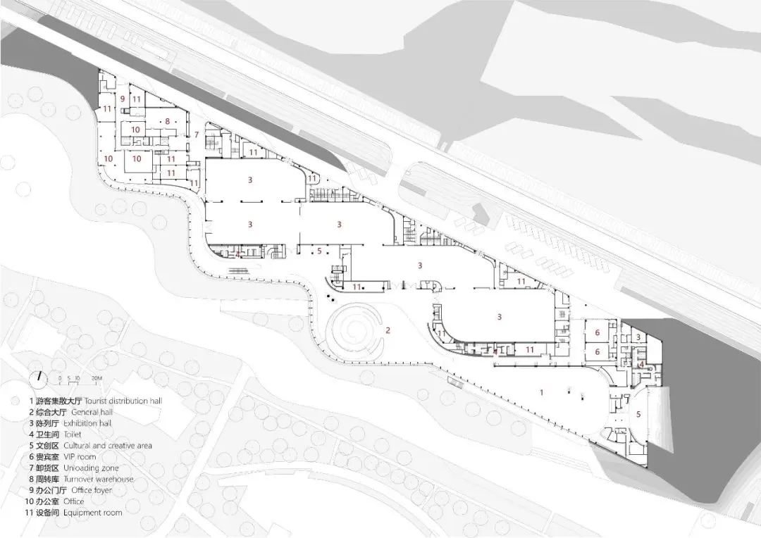 连绵的堆体形态也带来紧凑的建筑平面,通过化零为整的策略,将原本任务书中分离的新馆与游客中心合二为一,沿着游客动线,自东向西分别布置游客中心、公共展区、后勤库区。三个堆体单元由大到小、由高到低依次排列,同时朝向西南方向旋转26度,面朝三星堆遗址区的方向,形成博物馆与“遗址”之间的时空对话。