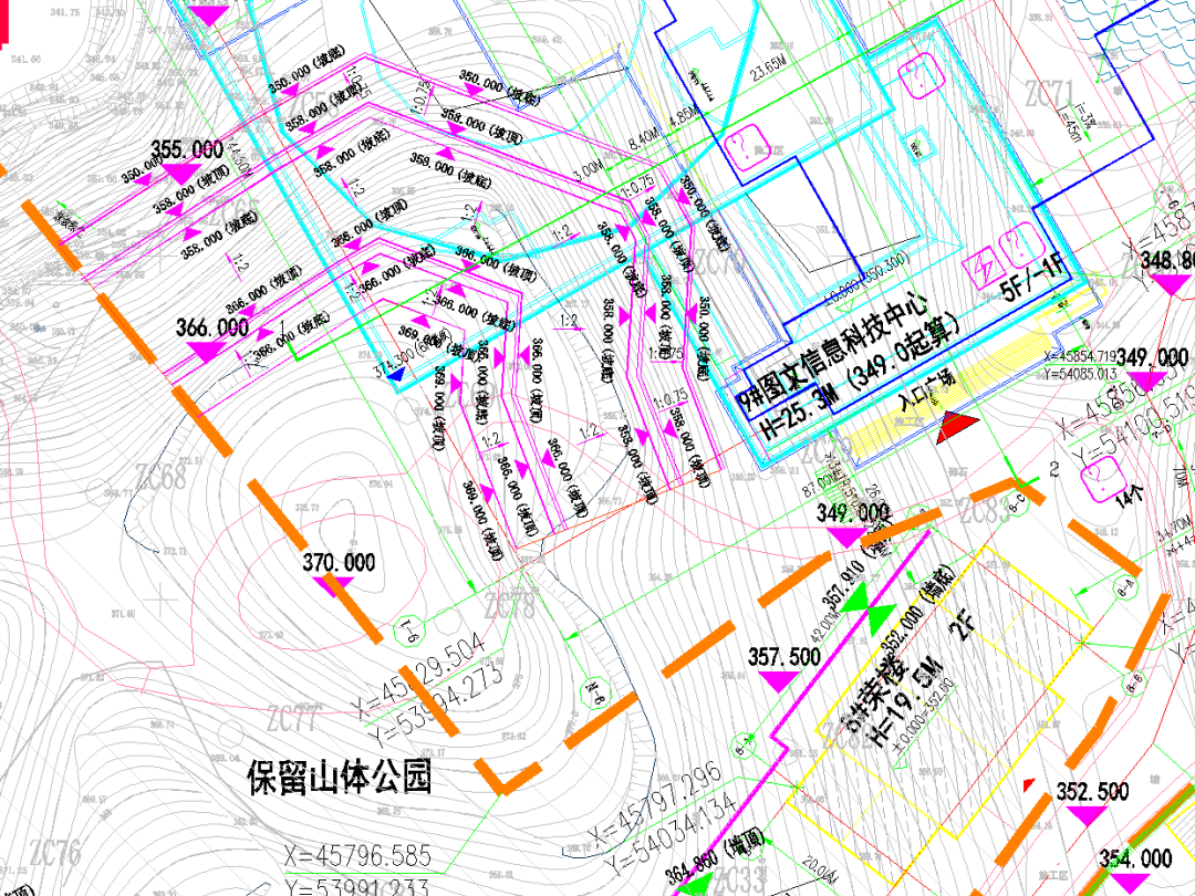 按设计标高场平后,场地内部及周边存在总长约2500m的环境边坡及基坑,其中岩质基坑最高约25m,高填方环境边坡最高约16m,属于超限高边坡,设计过程中尽量采用放坡护面处理,少量放坡条件不足的地方采用重力式挡墙及锚喷支护,尽量避免使用成本较高的抗滑桩,尤其是对于9#楼南侧图文信息科技中心高边坡,在建筑专业的配合下,对该处边坡走向及坡形进行了优化调整(详上图),边坡与岩层倾向的夹角由25°调整到了50°,避免了岩质顺向坡发生,有效降低了支护施工难度和工程造价,在保证支护结构安全的前提下,真正做到了经济合理、生态环保。