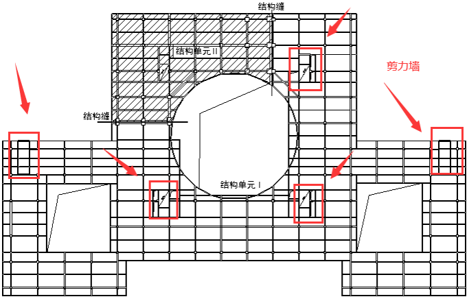 B.剪力墙加强:底部加强区部分剪力墙根据中、大震截面承载力验算,适当加厚;部分墙体提高水平钢筋配筋率,满足大震抗剪不屈服要求。
