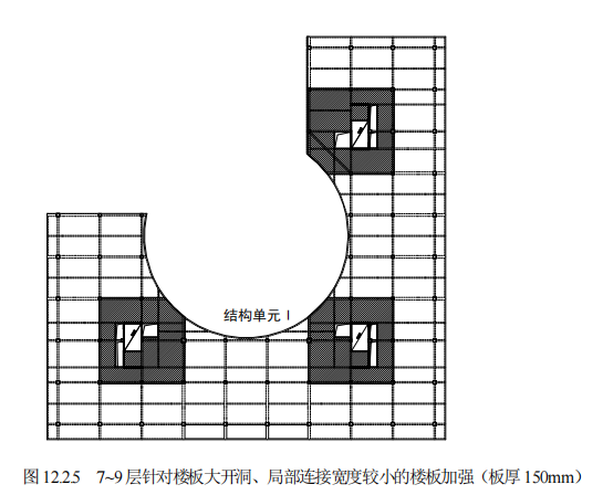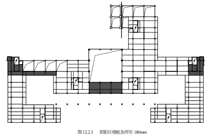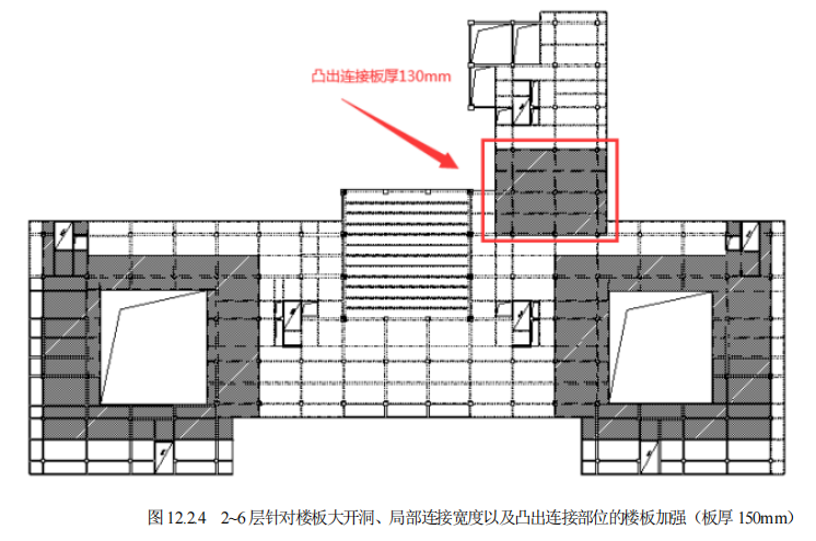 D.楼板加强:二层作为上接地层,楼板最小厚度150mm,连接薄弱部位加厚至180mm;楼板应力按中震弹性复核;局部开洞边及筒体边应力相对集中,楼板适当加厚,配筋率加强;6层以上竖向收进,相关范围楼板加厚至150mm,配筋率加强。