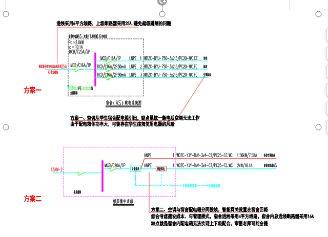 5.项目宿舍内设置分体空调,由于重庆夏天温度较高,直接从宿舍配电箱出线,若学校在晚上实行熄灯管理,则断电后空调将无法工作。为此,电气设计人员在设计以下两个方案时,与校方探讨,提前分析各种配电方案的利弊。