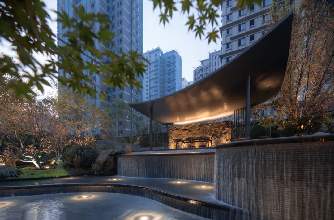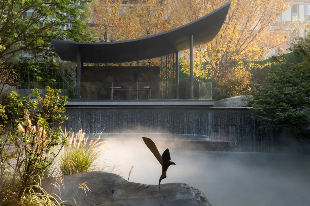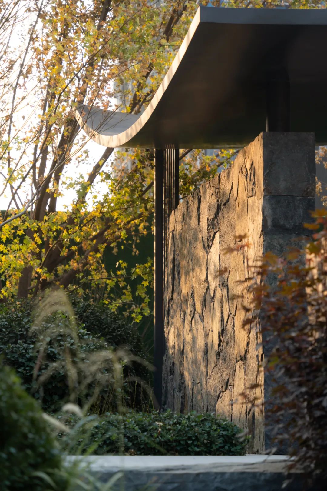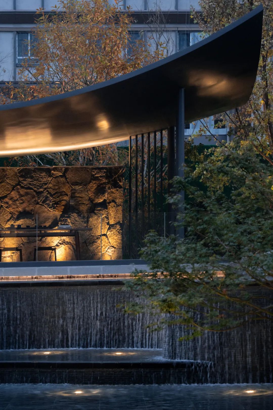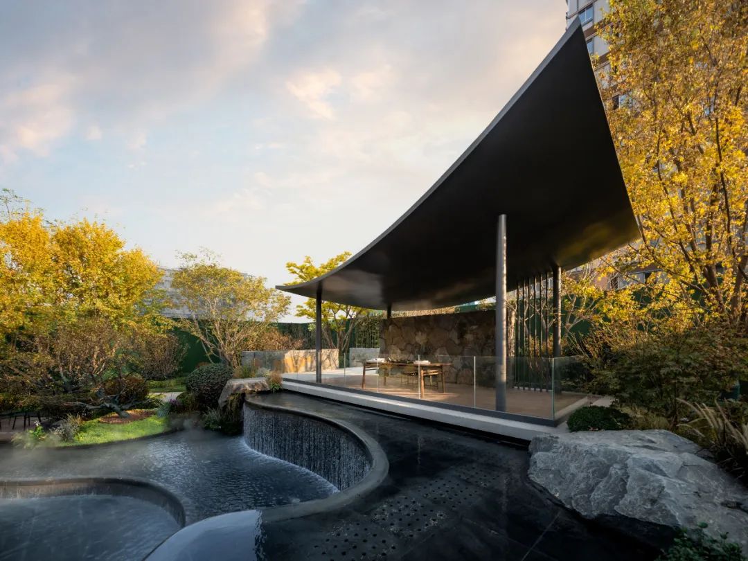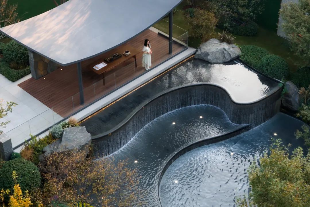 小筑以其小巧而雅致的特质,以及周围清幽的环境,展现出一种结合了卷曲面弧线造型的水景之美。这样的设计能柔化景墙的硬朗,使其在刚毅中透出柔和的美感。在这里,你可以感受到山林间自然水景的缓缓流淌,听到水流声缓缓入耳,仿佛置身于自然山水之间。