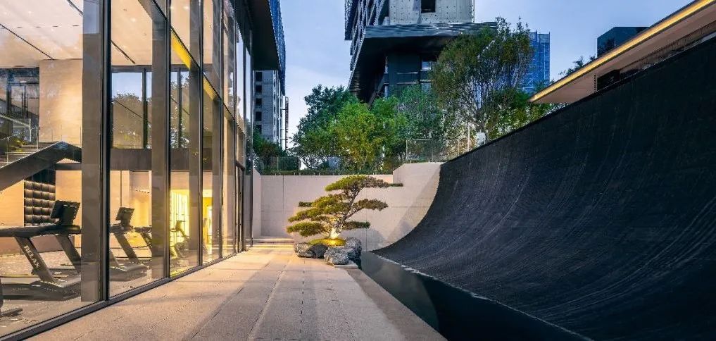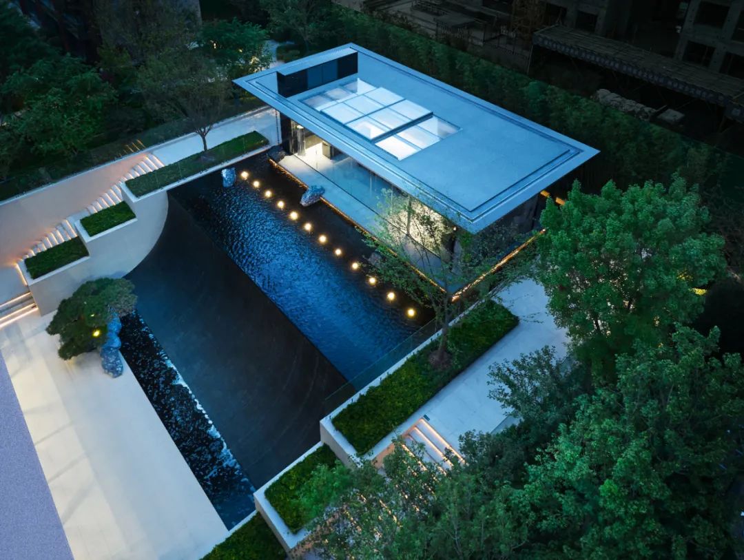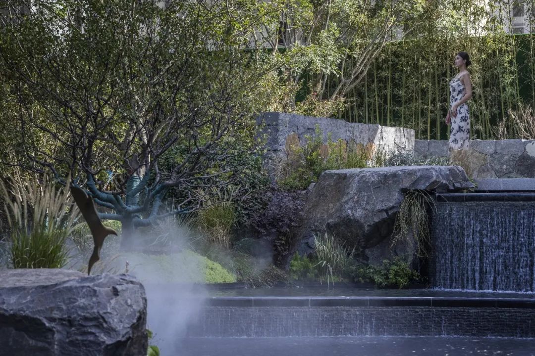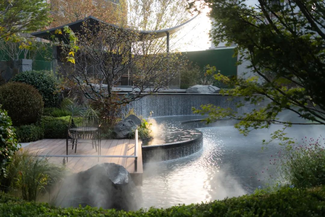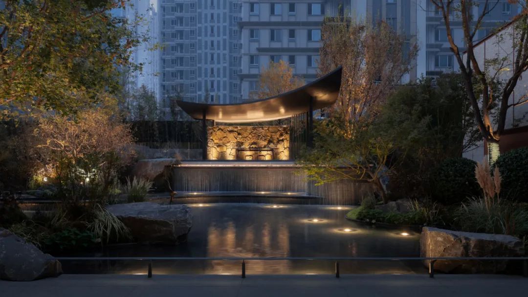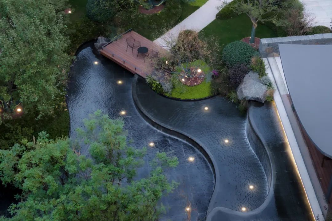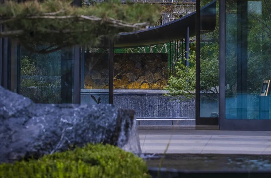 小筑以其小巧而雅致的特质,以及周围清幽的环境,展现出一种结合了卷曲面弧线造型的水景之美。这样的设计能柔化景墙的硬朗,使其在刚毅中透出柔和的美感。在这里,你可以感受到山林间自然水景的缓缓流淌,听到水流声缓缓入耳,仿佛置身于自然山水之间。