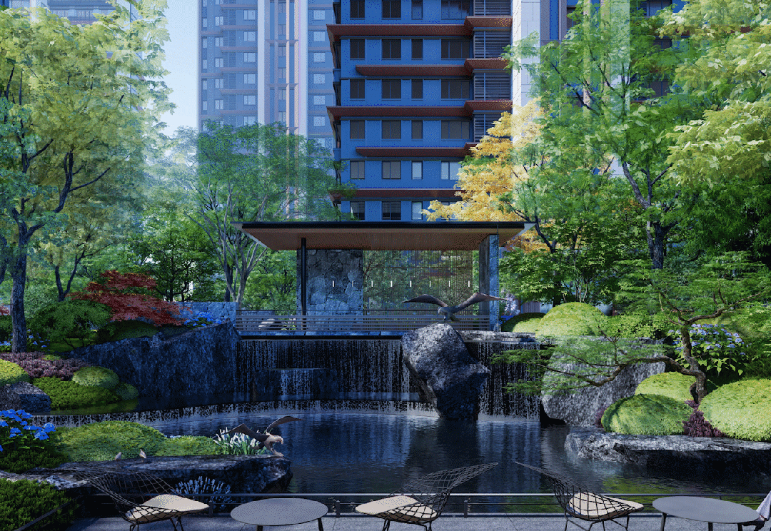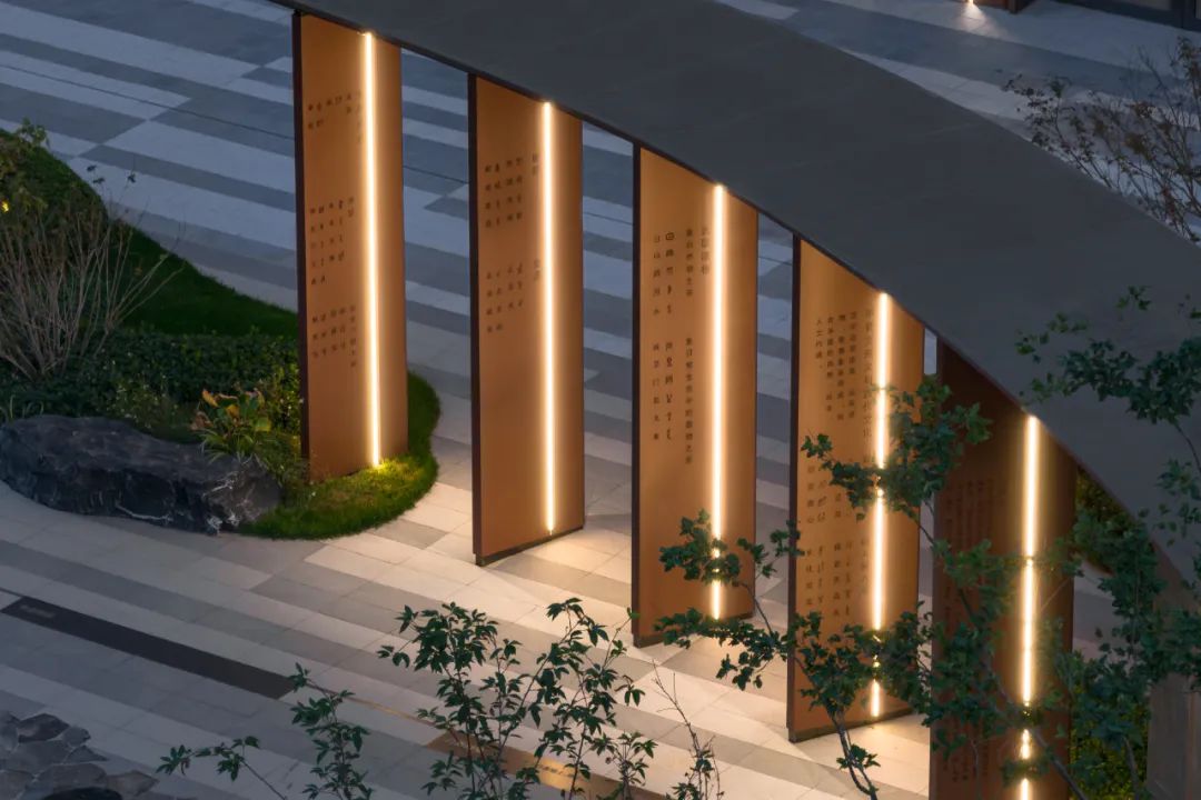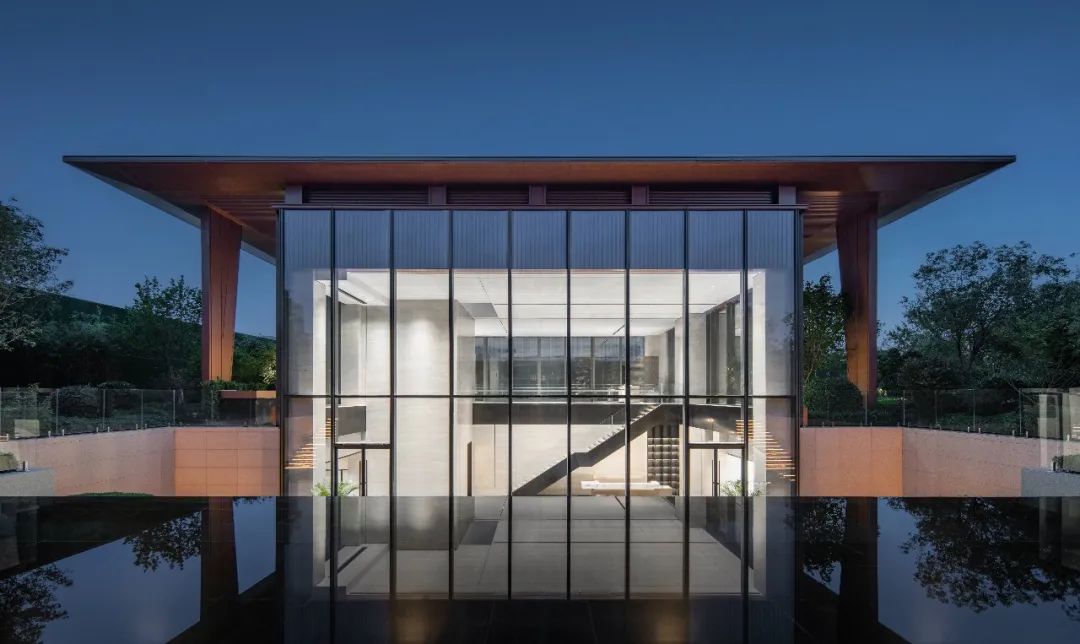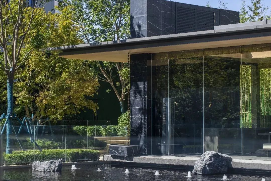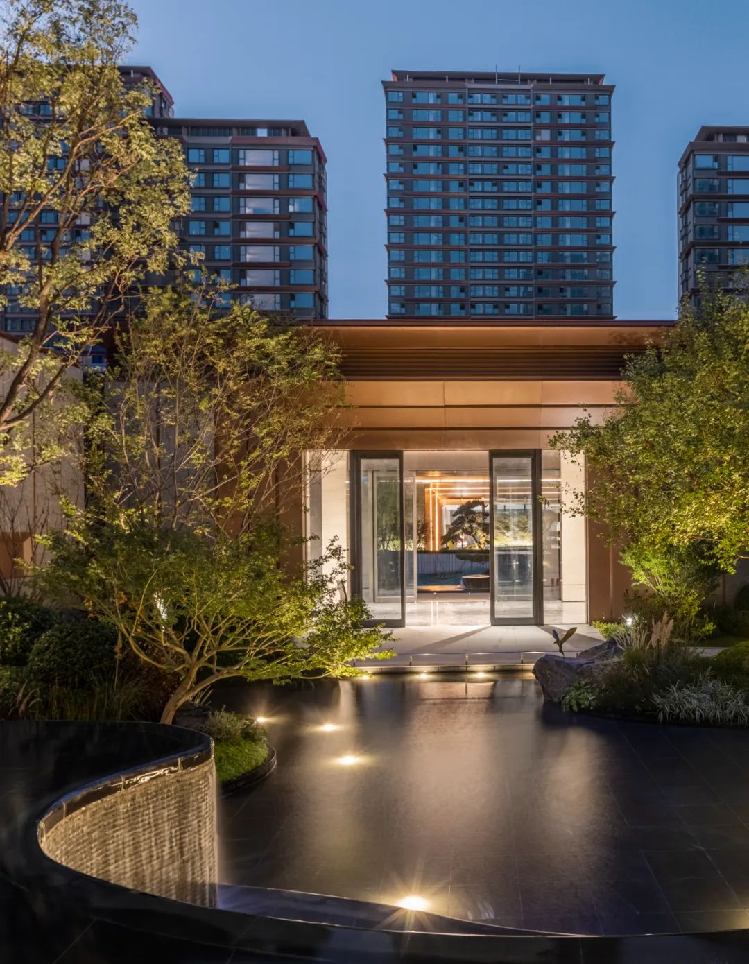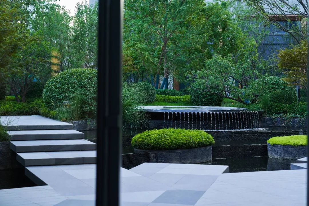 小筑以其小巧而雅致的特质,以及周围清幽的环境,展现出一种结合了卷曲面弧线造型的水景之美。这样的设计能柔化景墙的硬朗,使其在刚毅中透出柔和的美感。在这里,你可以感受到山林间自然水景的缓缓流淌,听到水流声缓缓入耳,仿佛置身于自然山水之间。