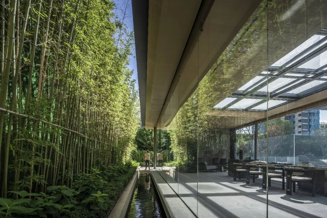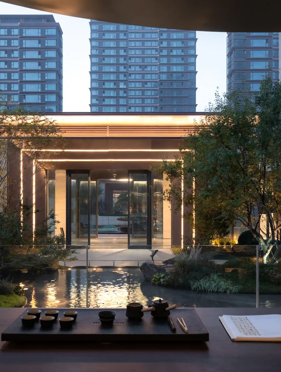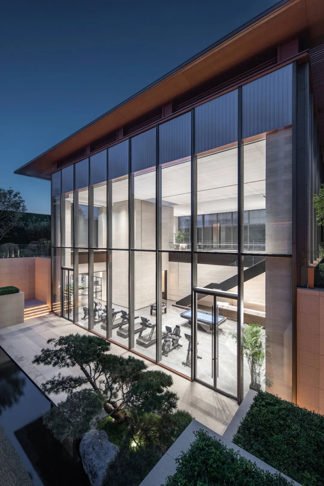 将宁静的空间与四季的繁华尽收眼底,小筑采用现代手法,打造出大气而优雅的飞檐,飞檐四出,如鸟张翼。在小筑的檐下,我们巧妙地运用了铃铛元素,将一串串铃铛设计成“铃铛”雨链。