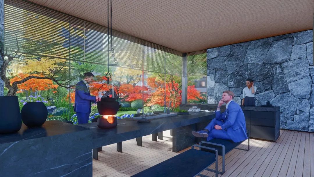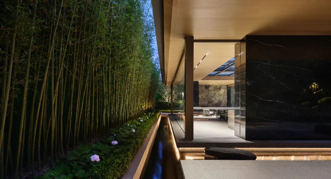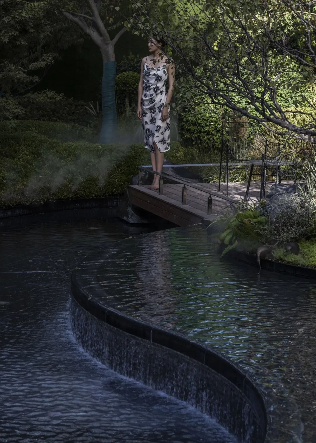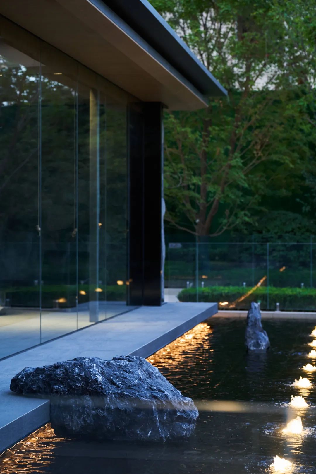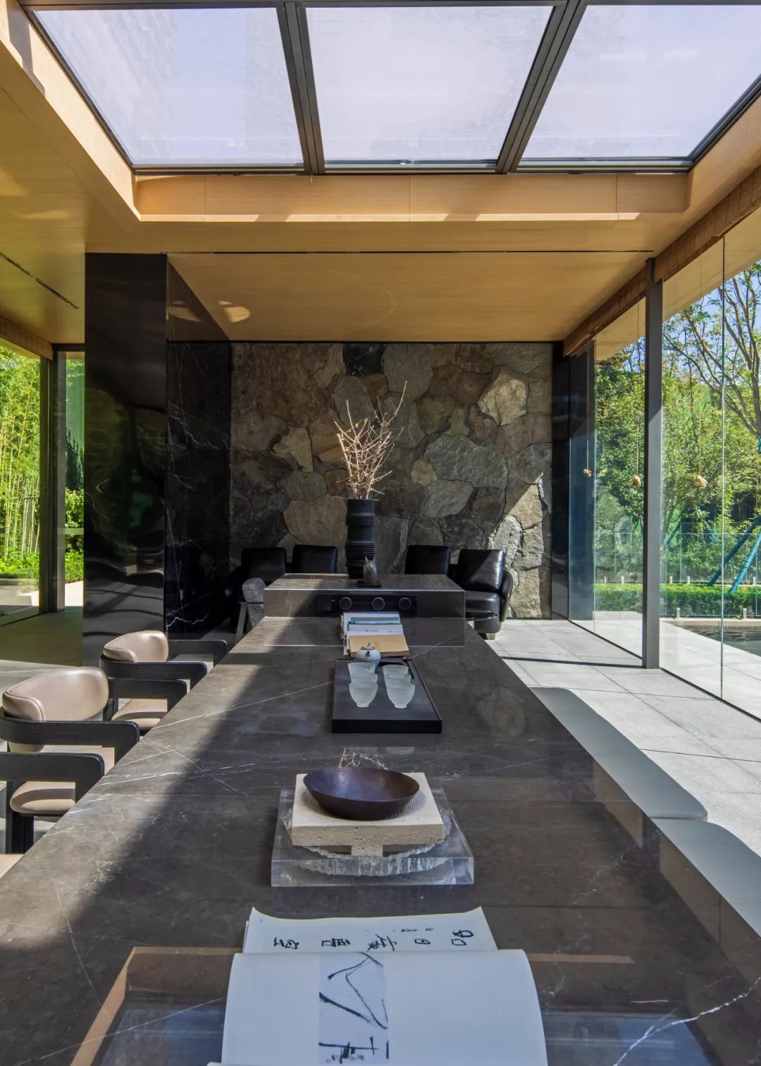 山涧跌瀑、浮光掠影、小筑茶室,一场关于山居的旅程由此展开。漂浮式亲水平台将室内功能延伸到室外,我们驻足溪边,再次感受山间的空灵体验和视觉上“多维度多感官”的空间享受,仿佛置身于无边的自然之中。