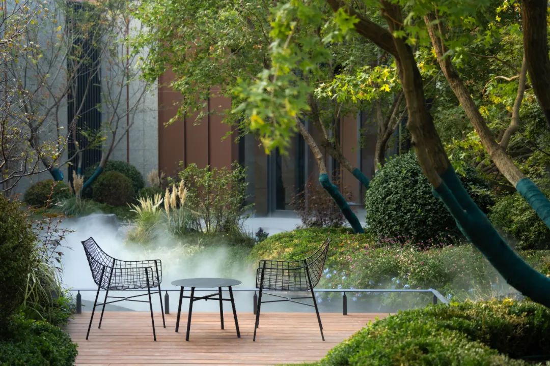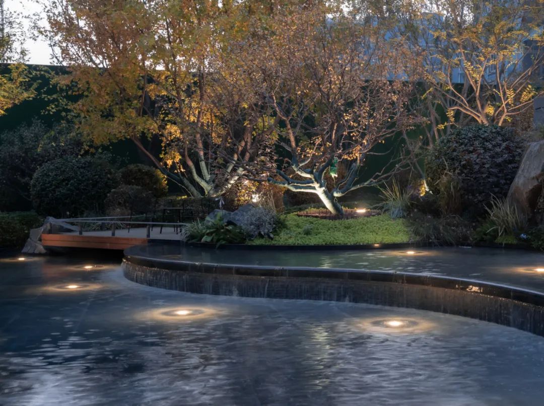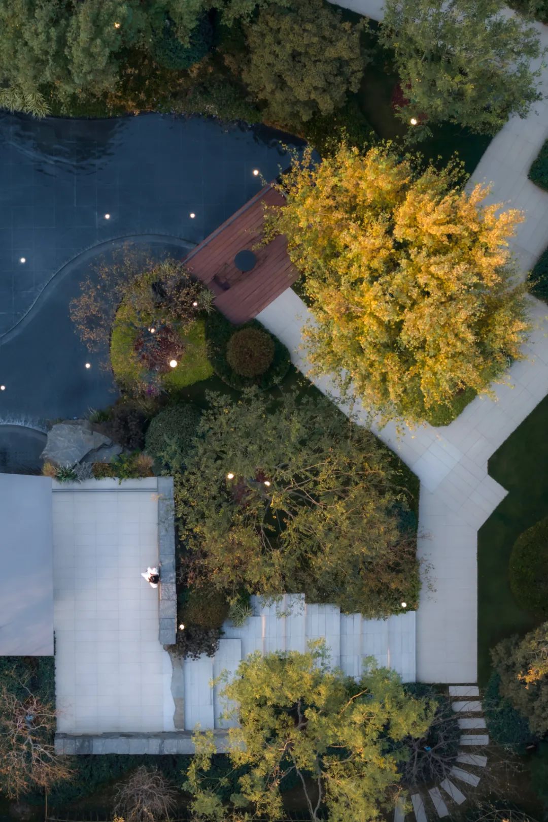 丘漫与枫类乔木的完美结合,打造了可供休闲观景的木平台,呈现出与众不同的“明月枫间照,清泉石上流”美景。采光井被巧妙地比喻为“明月”,并结合跌水设计,将普通的采光井融入林间主要观景点。同时,借用枫意和松柏的特色,让人仿佛身临其境,感受到大自然的四季美景。