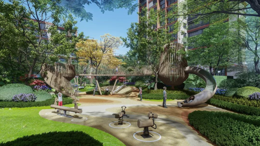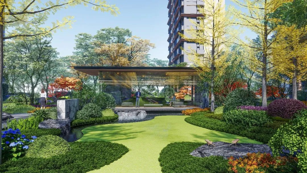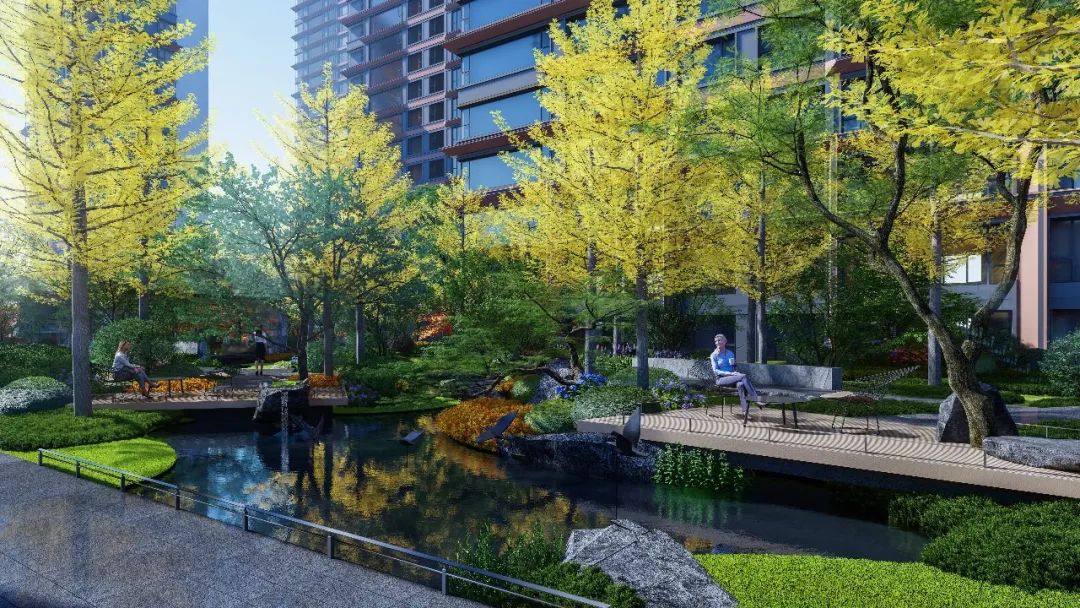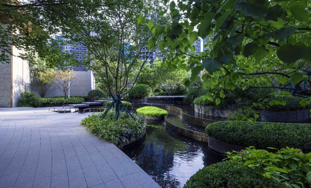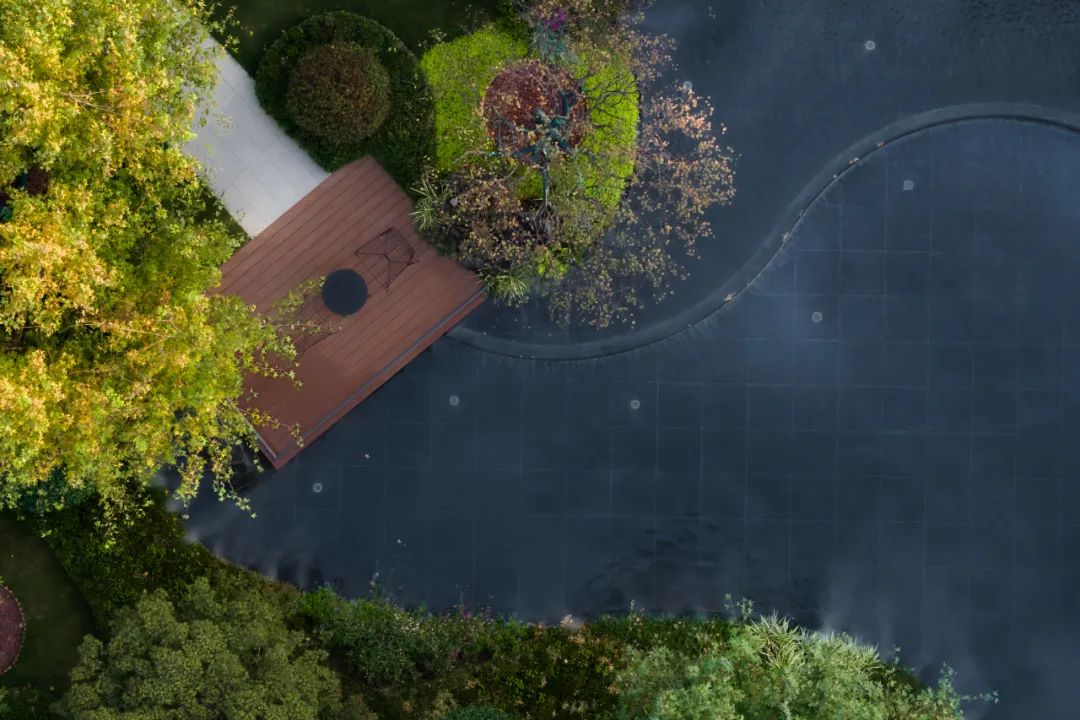 丘漫与枫类乔木的完美结合,打造了可供休闲观景的木平台,呈现出与众不同的“明月枫间照,清泉石上流”美景。采光井被巧妙地比喻为“明月”,并结合跌水设计,将普通的采光井融入林间主要观景点。同时,借用枫意和松柏的特色,让人仿佛身临其境,感受到大自然的四季美景。