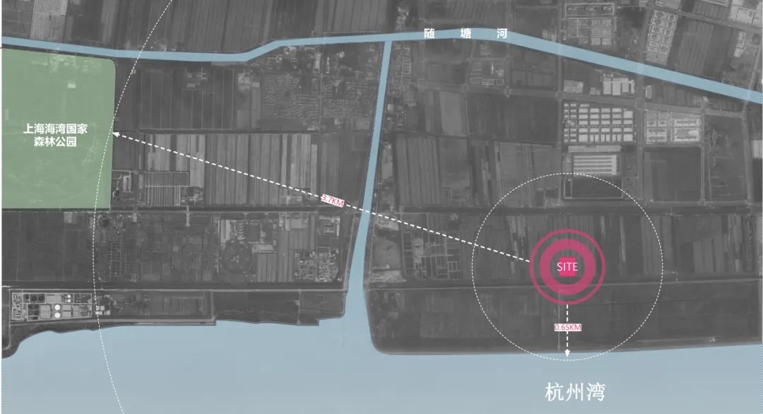 基地北侧为随塘河,南侧为风景优美的杭州湾,西侧为上海海湾国家森林公园。景观条件得天独厚,可享受到优越的景观资源,与研发、办公、生产空间产生互动。