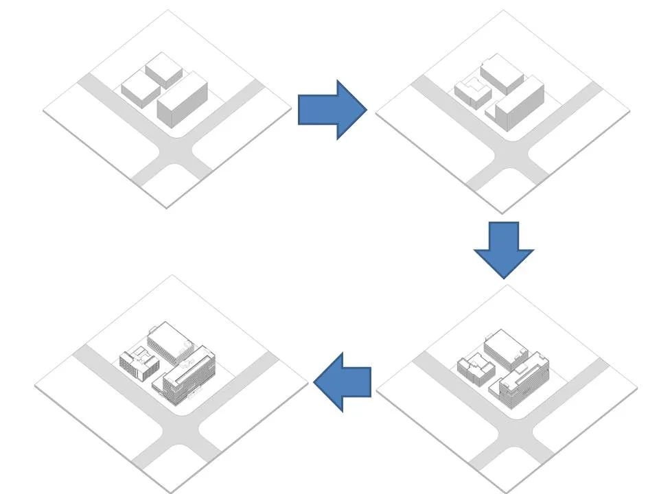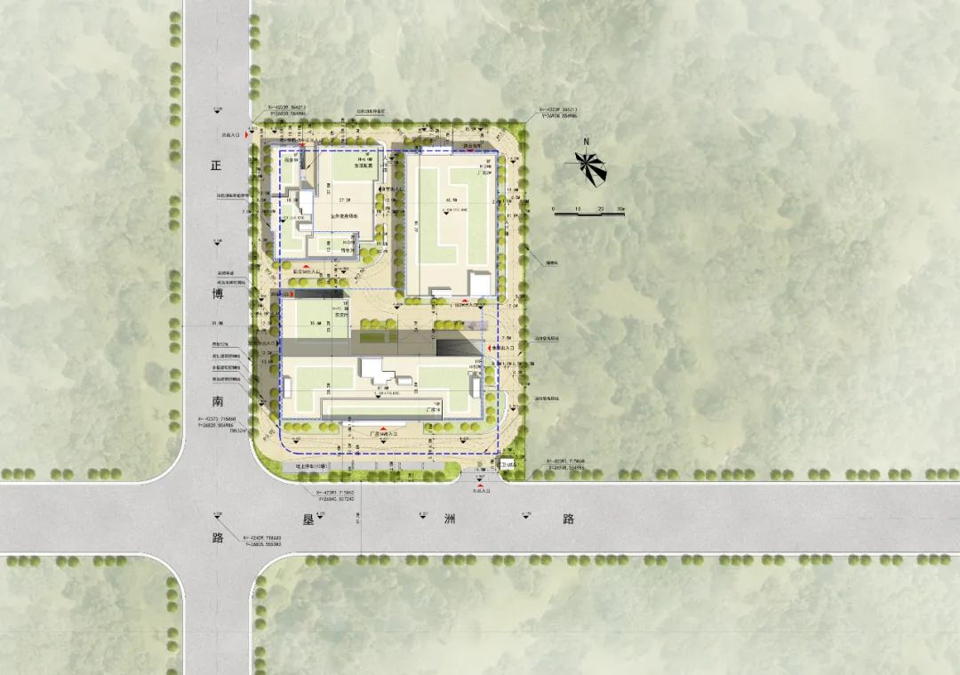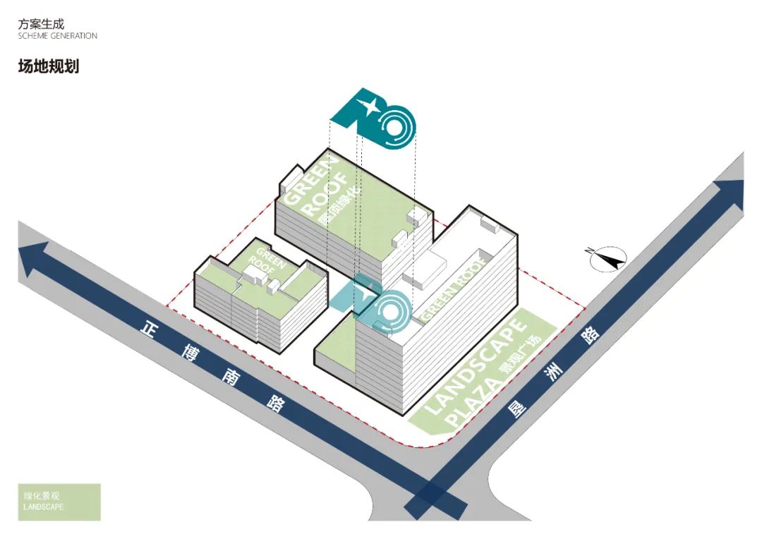 基于对整个场地进行的合理的规划,在南侧与西侧道路分别设置一个主出入口及一个次要出入口;完善后体块,体块之间及体块与场地之间分别形成屋顶绿化、内院绿化及南侧的广场绿化;将睿昂基因的logo元素置入中央庭院,形成带有企业印记的标志性规划。
