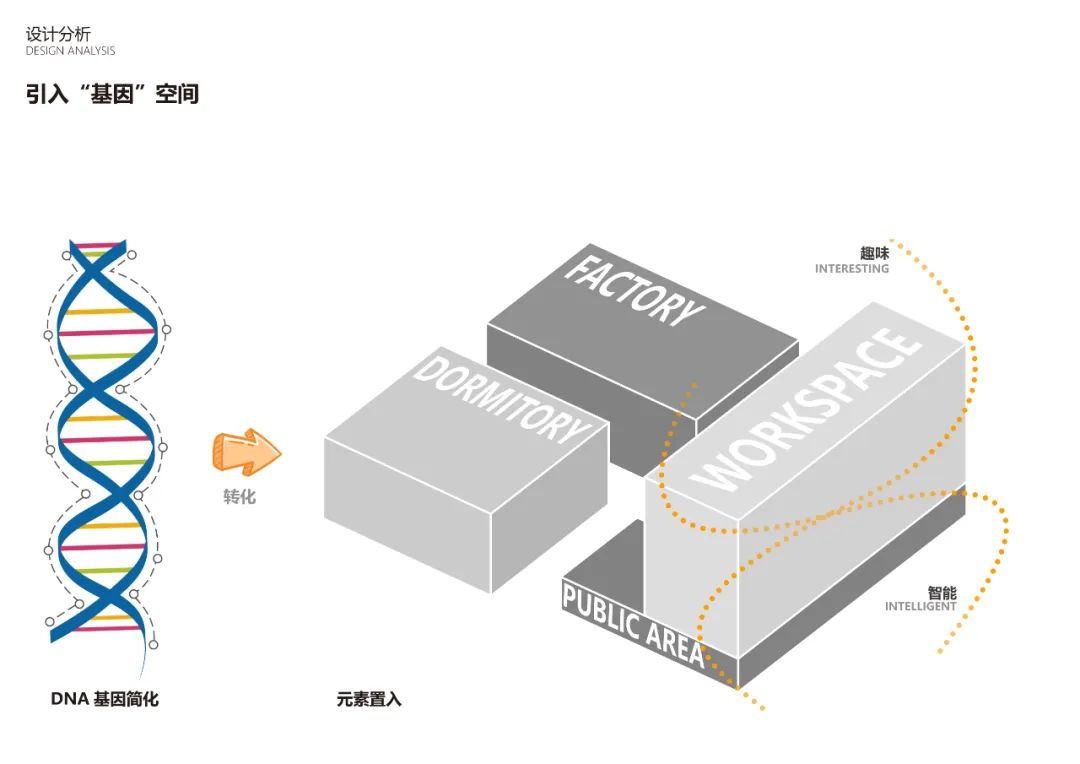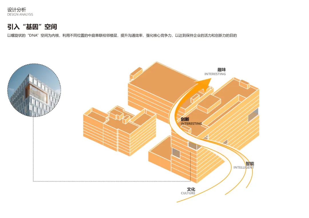 将“基因” 的基本段置入建筑的空间中,强化办公空间系统的创新内核,以开放灵活的办公空间,保持空间弹性,从而增强互动交流、激发创新潜能。