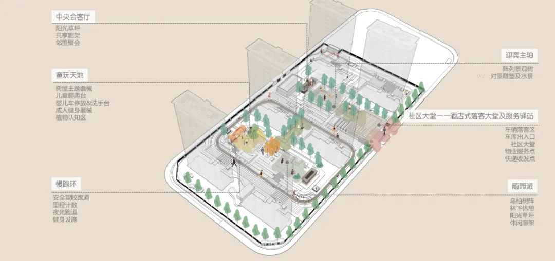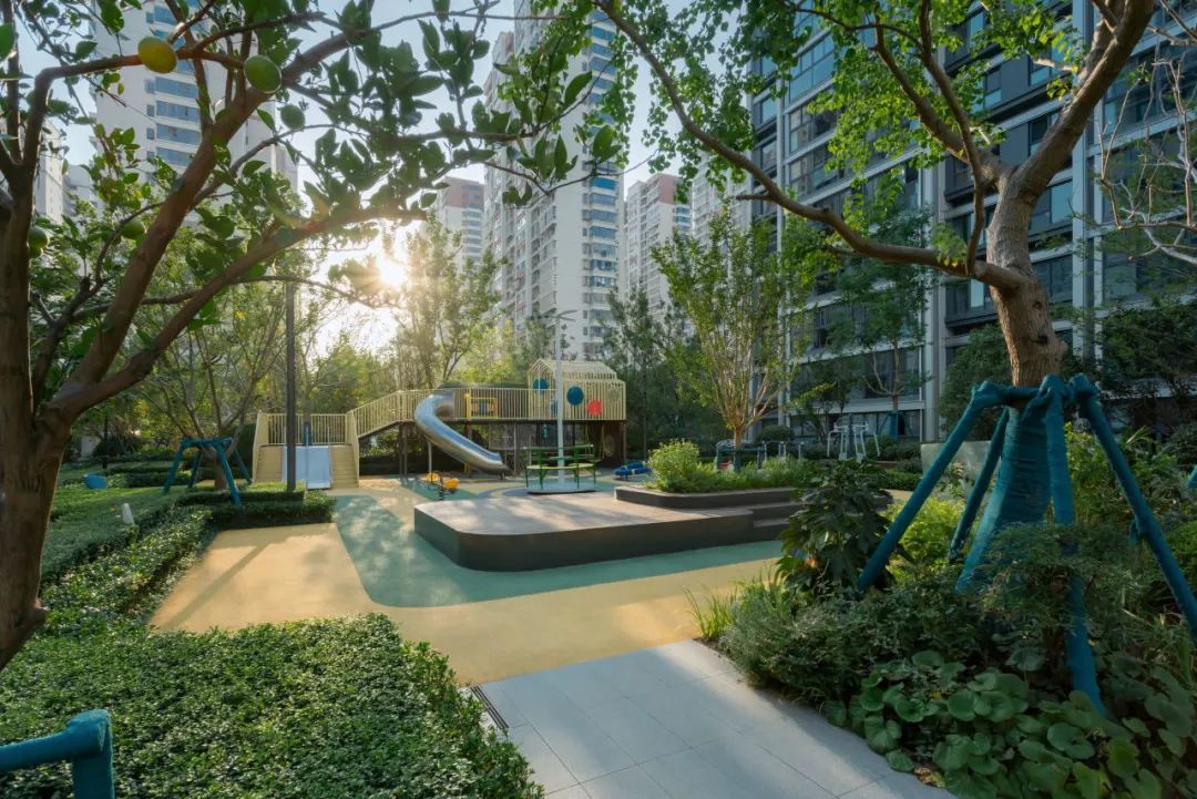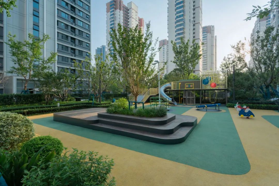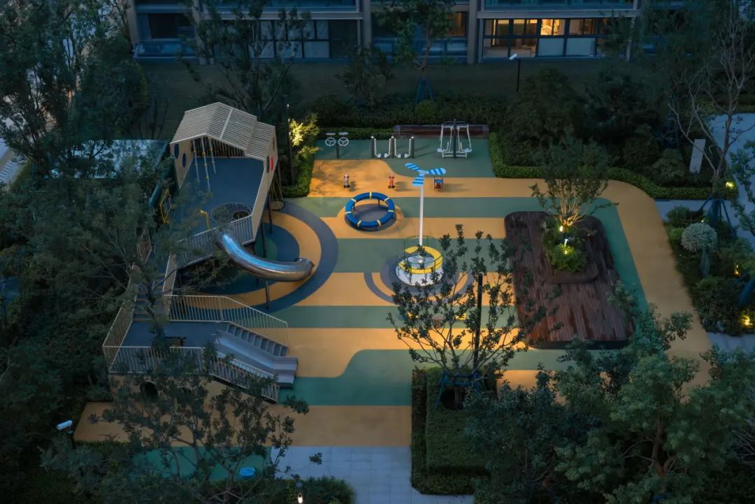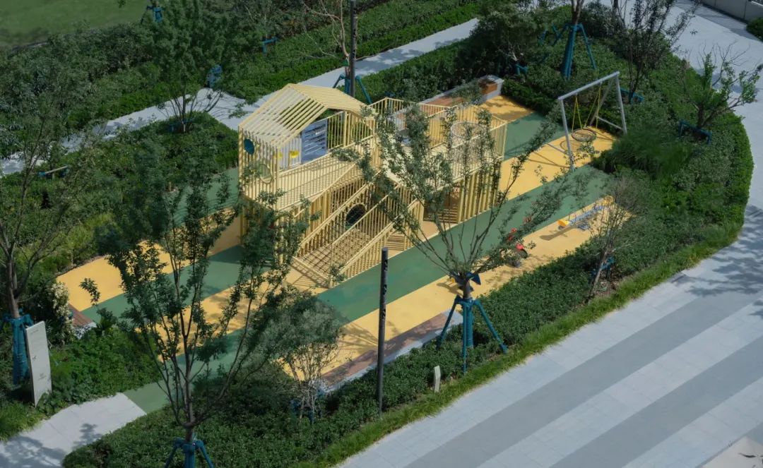 将定制活动构架作为儿童活动的功能主体,由绿化围合场地,保证场地舒适、安全。