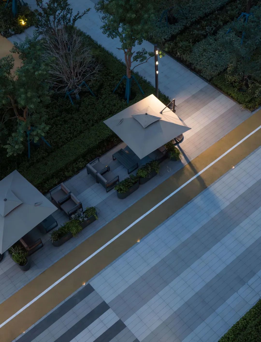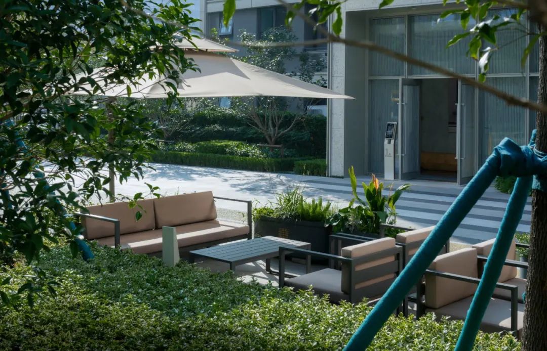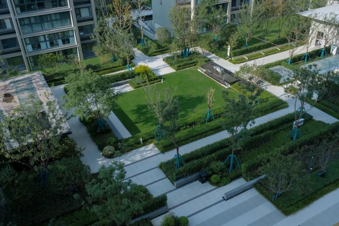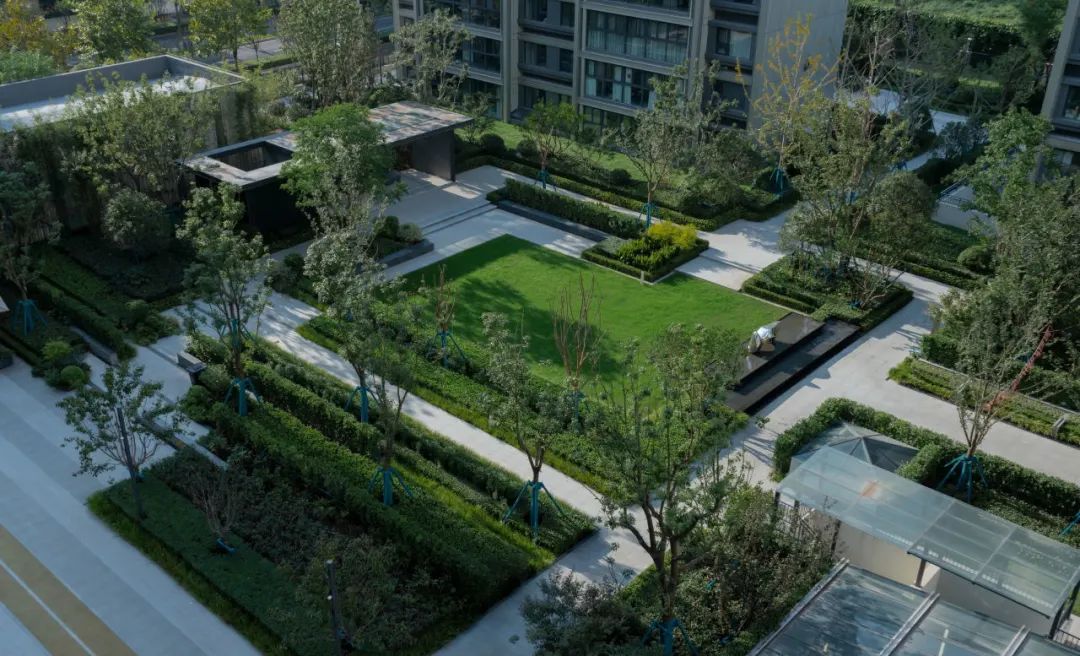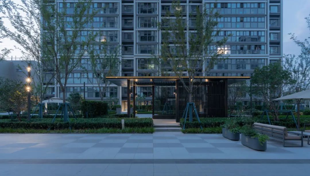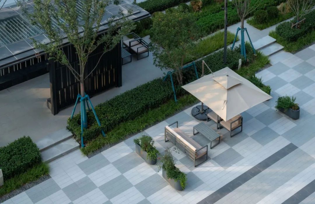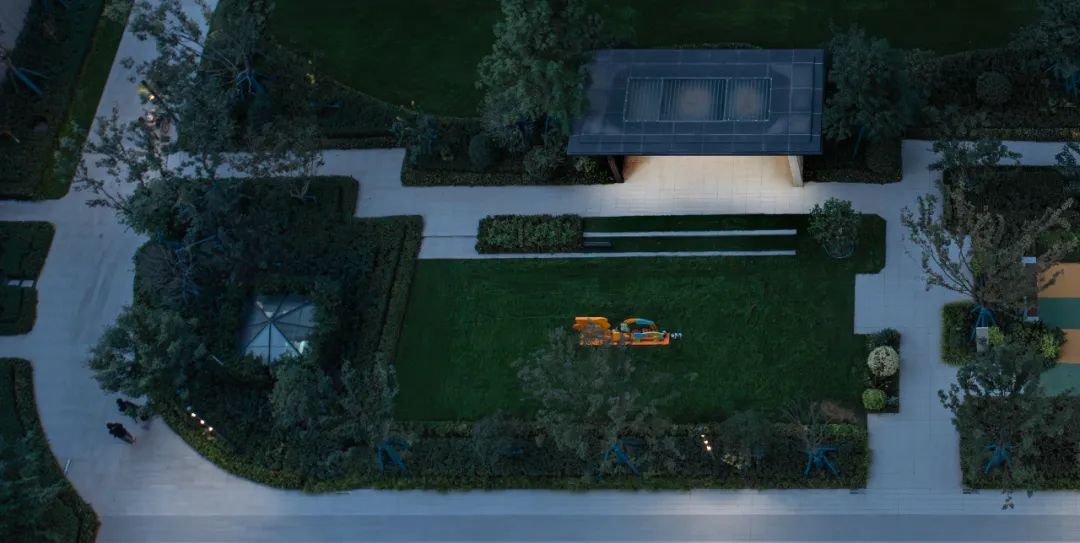 中央草坪⾯积约300㎡,以会客廊架收尾,是社区的社交中心,也为夏日剧场、亲⼦互动、社区活动提供开阔、舒适的场地。