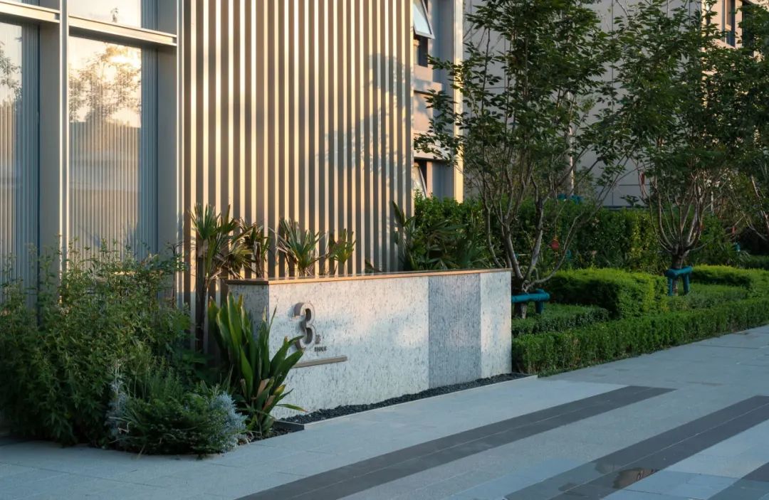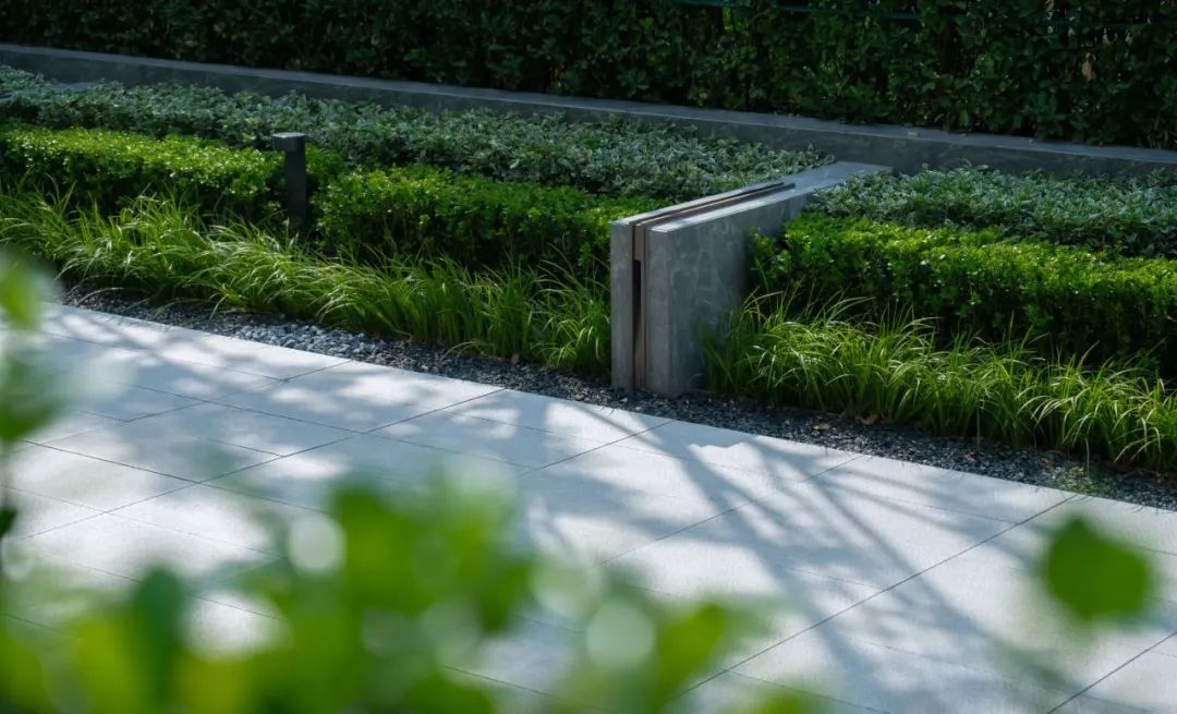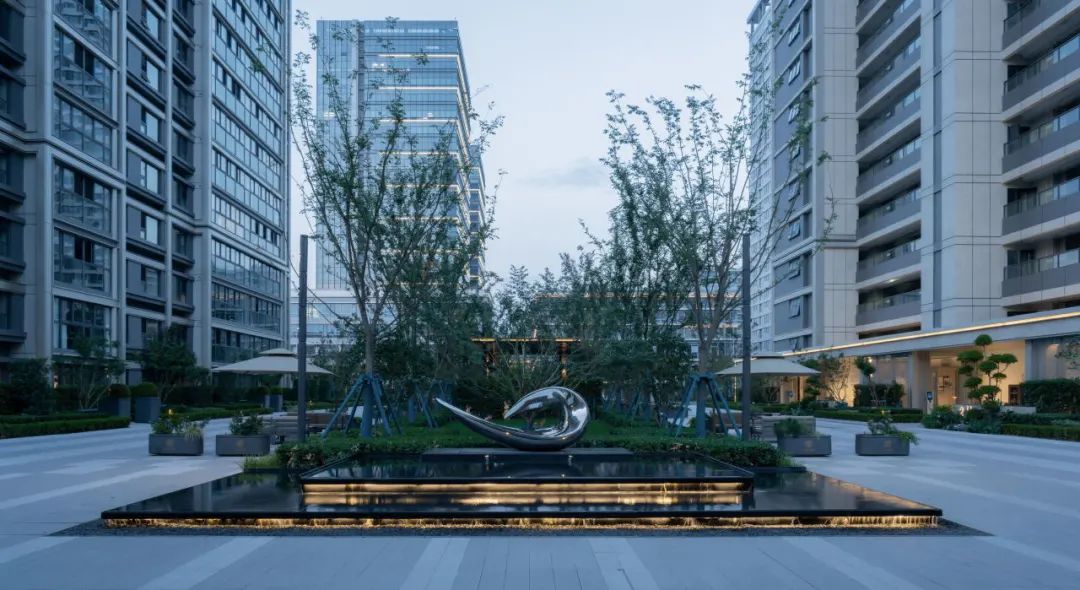 双层跌⽔,⻥形雕塑,背衬列植榉树,作为进⼊园区的第⼀处景观彰显尊贵的园区调性。